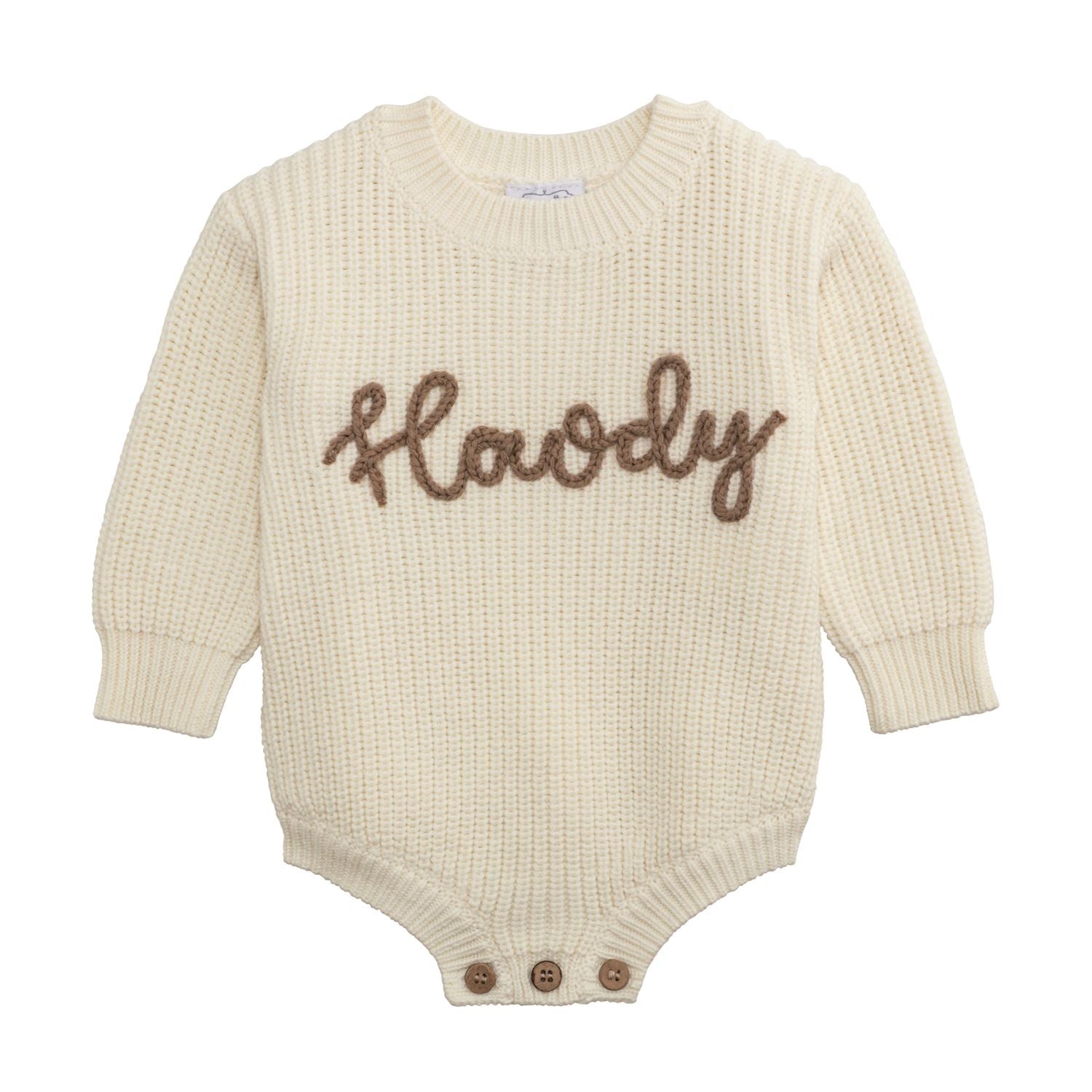 Say “Howdy” in the cutest way possible! This cozy baby bubble romper features a warm cream waffle knit with raised chenille-style embroidery across the chest. Soft, stretchy, and just right for snuggly fall days. Designed with button leg snaps for quick diaper changes.
