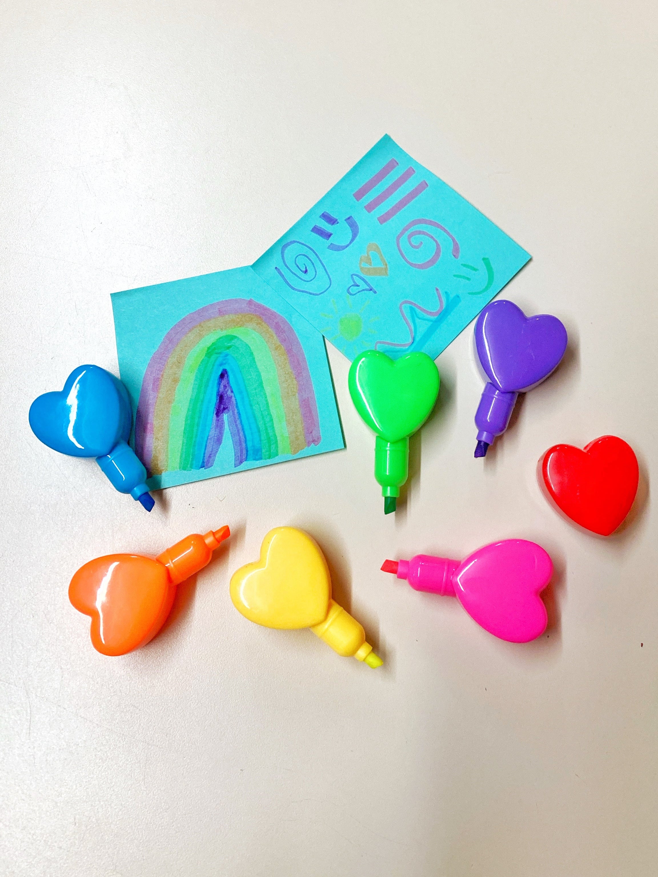 Rainbow Colors: The set includes multiple highlighter colors, typically representing the full spectrum: red, orange, yellow, green, blue, and purple/pink. Each heart contains its own color of ink.