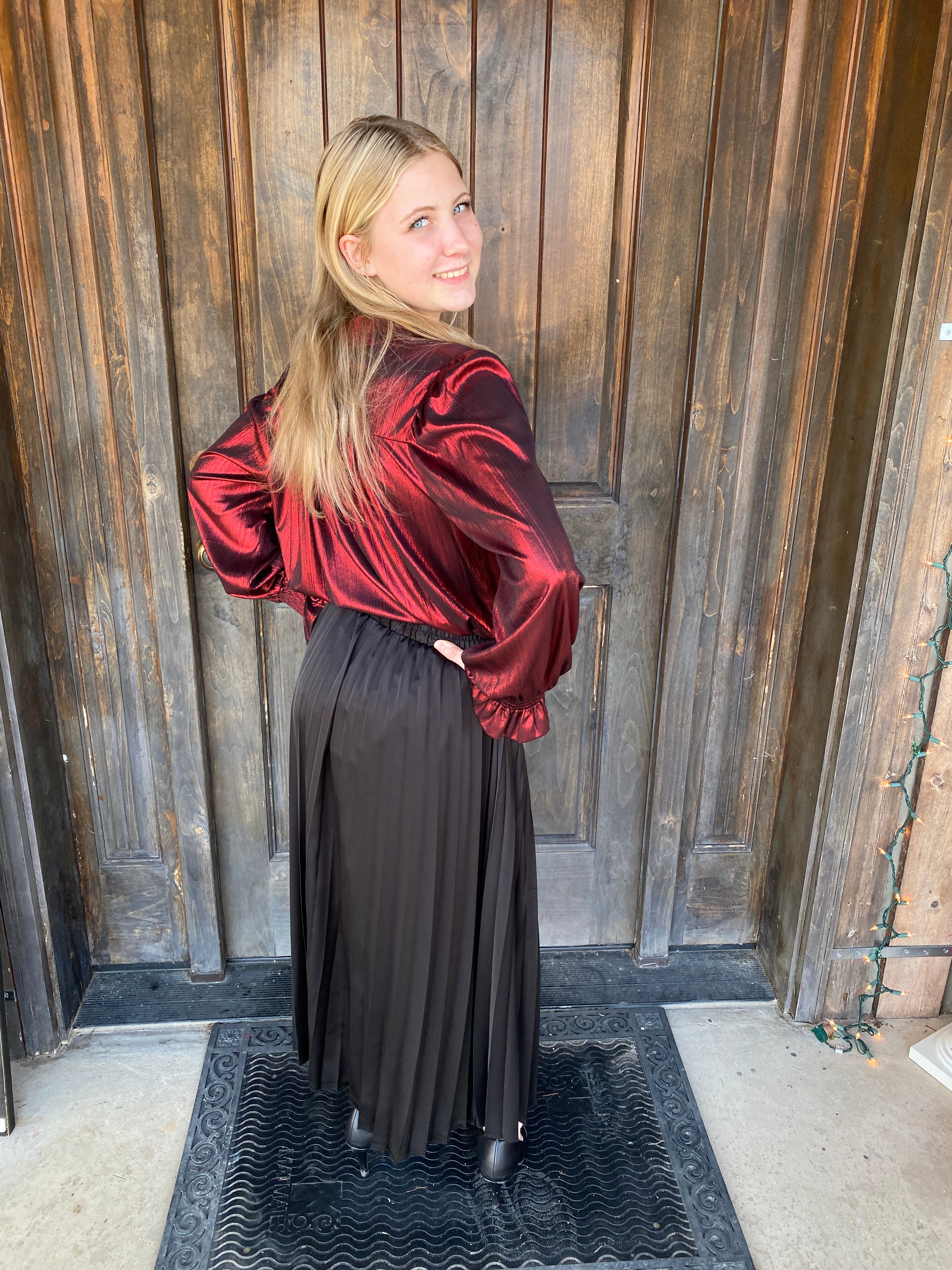 Elevate your wardrobe with timeless elegance in our Black Townes Pleated Midi Skirt. Designed in a luxurious poly satin fabric, this skirt delivers effortless movement with a beautiful sheen. The flattering midi length and flowing pleats make it a versatile piece that transitions seamlessly from daytime chic to evening glam.