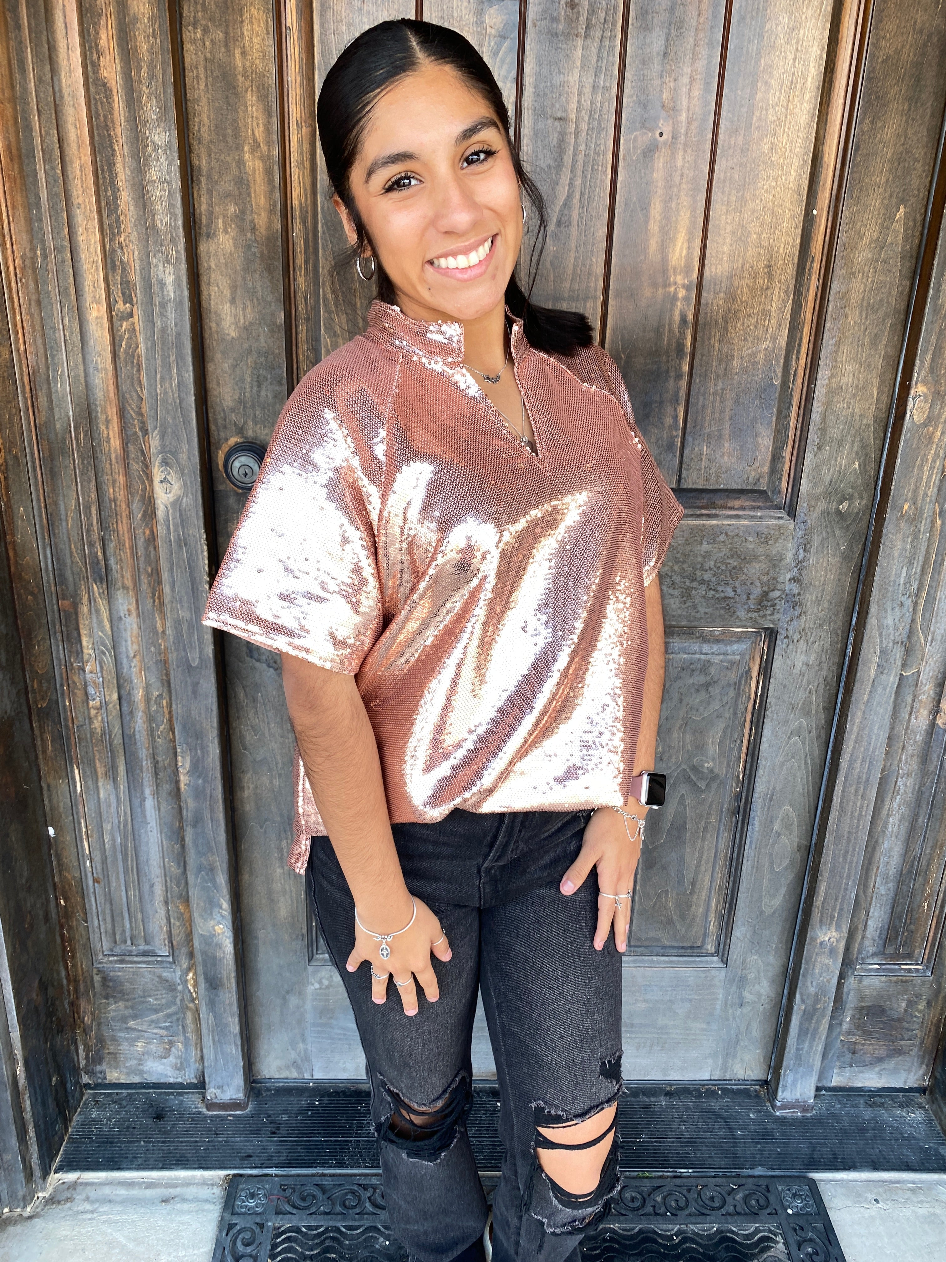Step into the holiday spotlight with this Shimmering Holiday Cindy Lou Hou Sequin Top! Dazzling and chic, this V-neck top is fully covered in rose gold sequins, making it perfect for holiday parties, New Year’s Eve, or any festive occasion. Designed for comfort and style, it pairs beautifully with jeans, leggings, or your favorite holiday skirt. With its relaxed fit and statement-making sparkle, this top is a must-have for anyone looking to add glamour to their seasonal wardrobe!