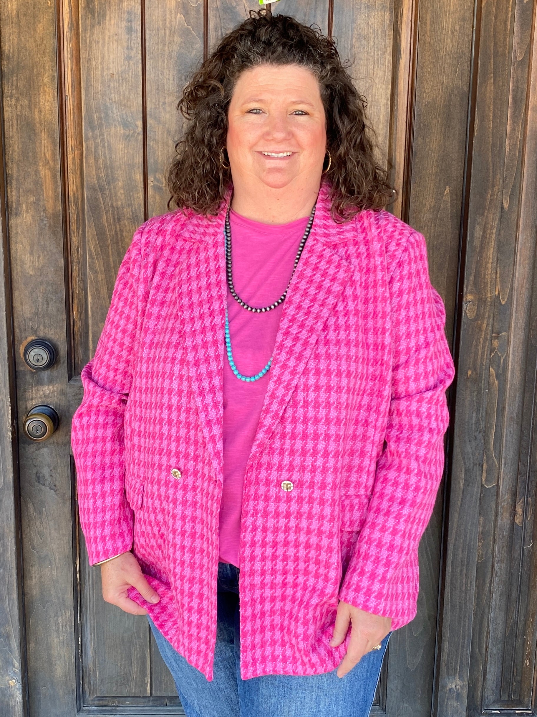 Meet your new go-to layering piece — the Elle Pink Blazer brings a bold pop of personality with classic structure and all-day comfort. Featuring a timeless houndstooth print in vibrant pink, this statement blazer instantly elevates any outfit — from jeans and a tee to holiday-ready sparkle.