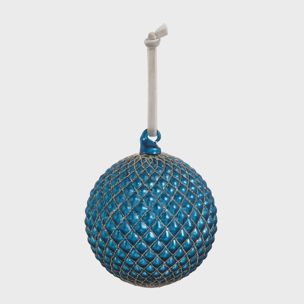 The elegant quilted design is further enhanced by delicate golden glitter outlining each diamond shape, adding a subtle shimmer and a touch of festive glamour. Perfect for enhancing a coastal-themed Christmas tree, complementing a jewel-toned display, or simply adding a pop of color to any holiday arrangement, this ornament hangs gracefully from a soft, off-white fabric cord, ready to bring an air of refined elegance to your festive celebrations.