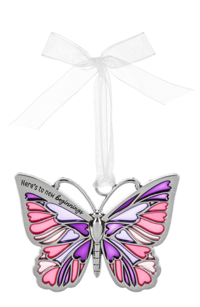 The zinc butterfly features vibrant wings filled with translucent enamel in shades of pink, magenta, and purple, creating a striking stained-glass effect. Engraved across the wings is the celebratory message: "Here's to new beginnings." Finished with a crisp white organza ribbon for hanging, this piece makes an ideal gift for occasions like graduation, a new job, a move, or simply starting a new chapter in life