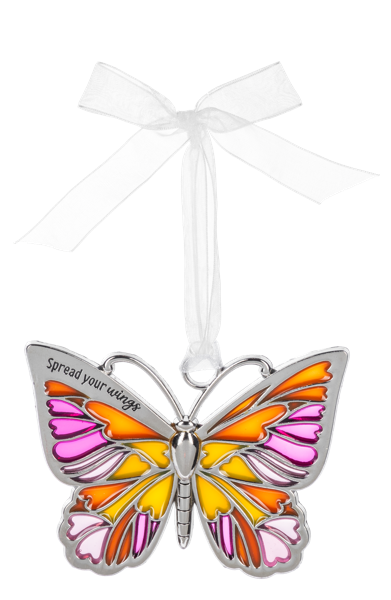 Design: The ornament features a beautifully detailed zinc butterfly with wings filled in with bright, translucent enamel, creating a stained-glass effect. The color palette is a mix of warm and bright hues, primarily orange, yellow, and pink.