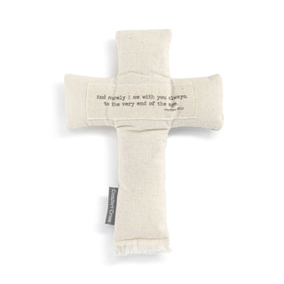 Patchwork-style soft cross with 'forget me not' text on a white background