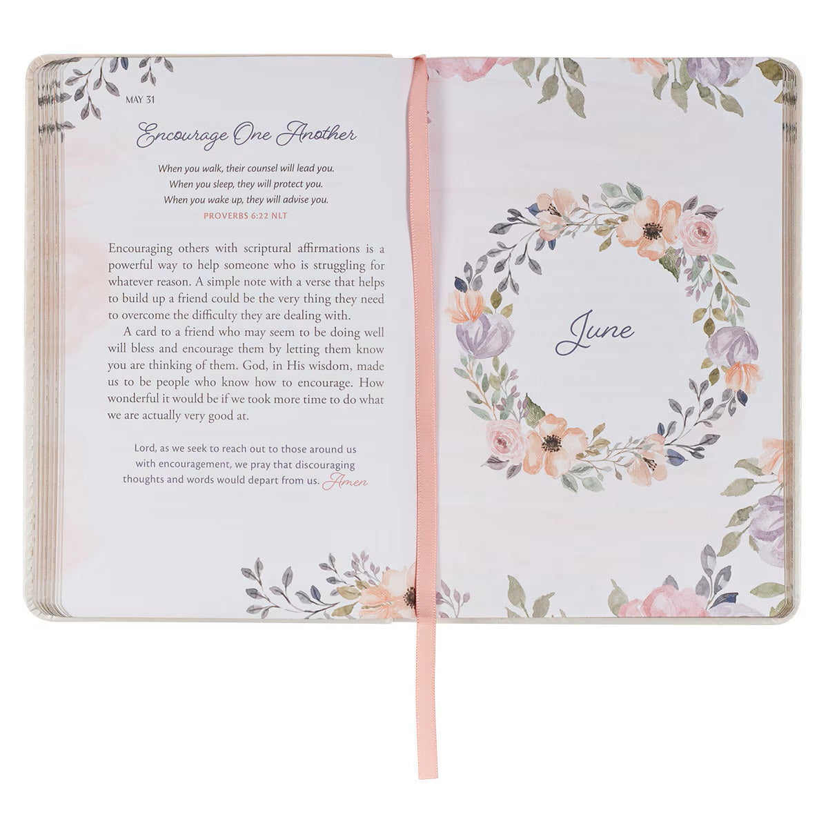 The inside pages are printed in full color and feature decorative floral elements in the same peachy palette as the cover. The page edges are gold foiled to beautifully complement the gold foil accents on the daily devotional's cover.