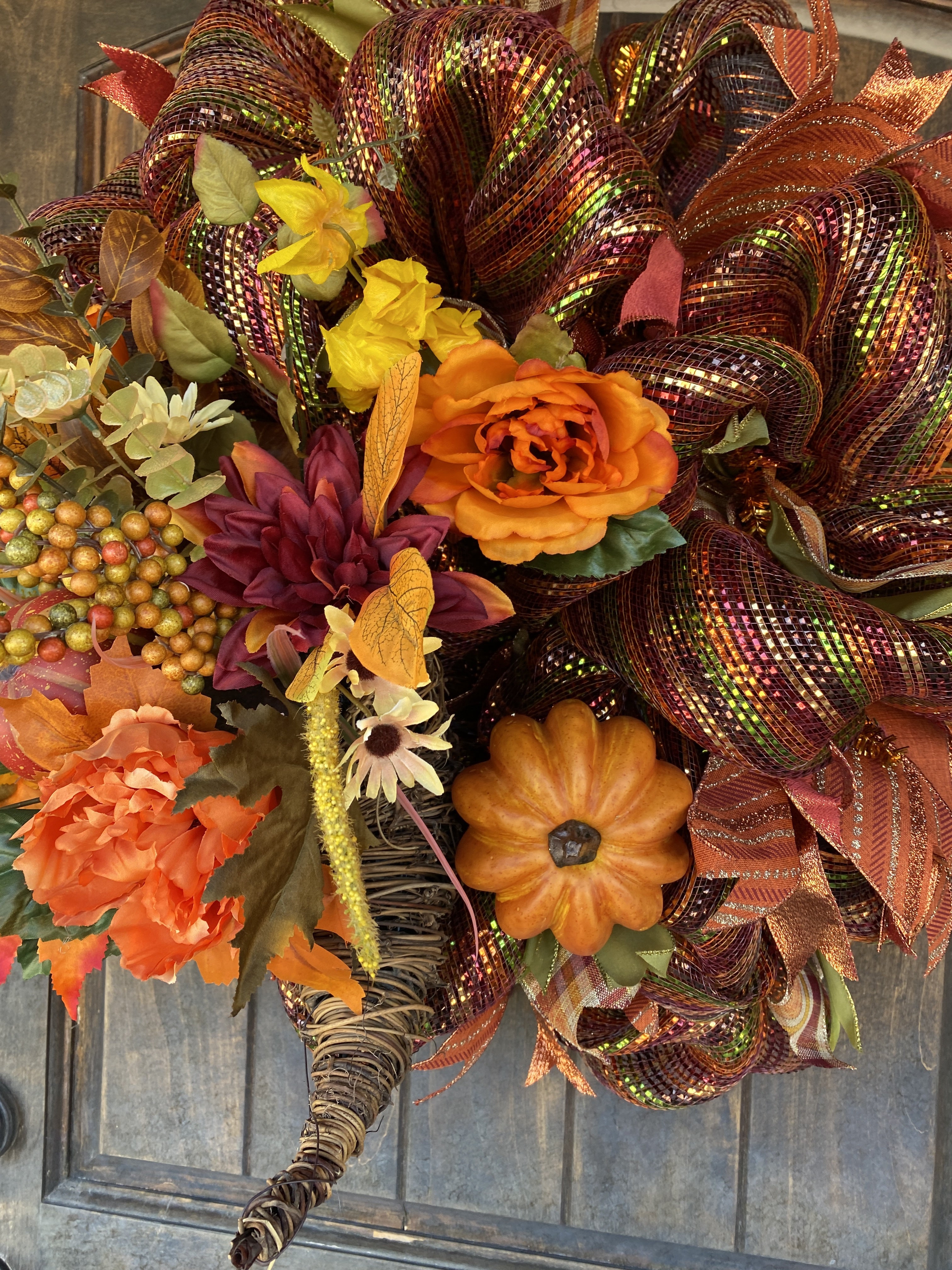 #CornucopiaWreath #FallWreath #ThanksgivingDecor #HarvestWreath #AutumnDecor #PumpkinWreath #RusticFallDecor #FarmhouseFall #HandcraftedWreath #CopperMeshWreath