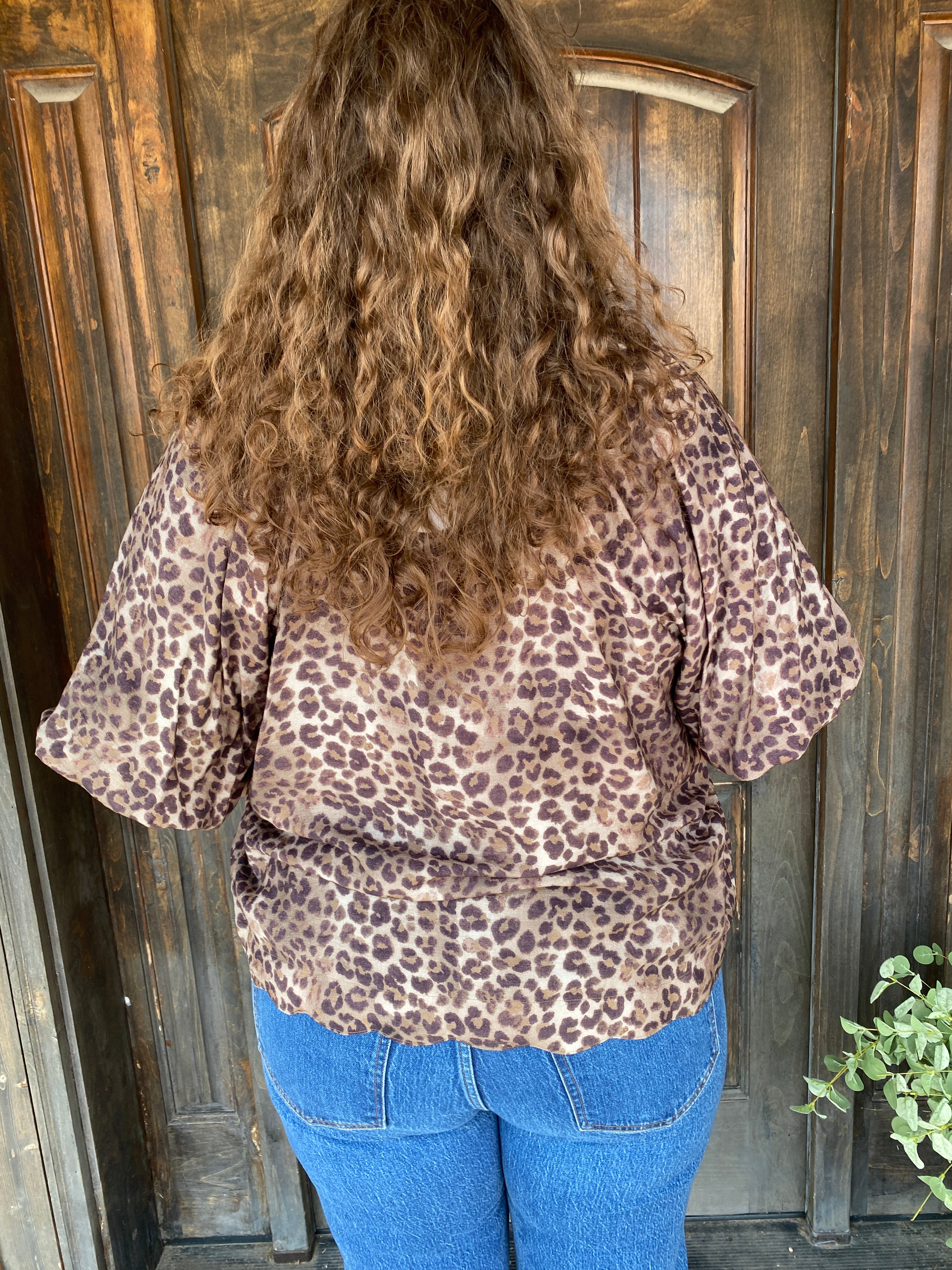 Make a bold statement with the Scallop Hem Leopard Print Blouse. This chic and modern top features a classic leopard print in an olive and brown color palette, perfect for elevating your everyday style. The V-neckline and relaxed drop shoulders create a comfortable, effortless fit, while the scalloped hem adds a unique and delicate touch. Balloon short sleeves provide a trendy, voluminous silhouette that feels light and airy. This unlined blouse is the perfect way to add a bit of daring flair to your wardrobe. It's a versatile piece that looks great with jeans, slacks, or a skirt. Available in sizes small to 2X.