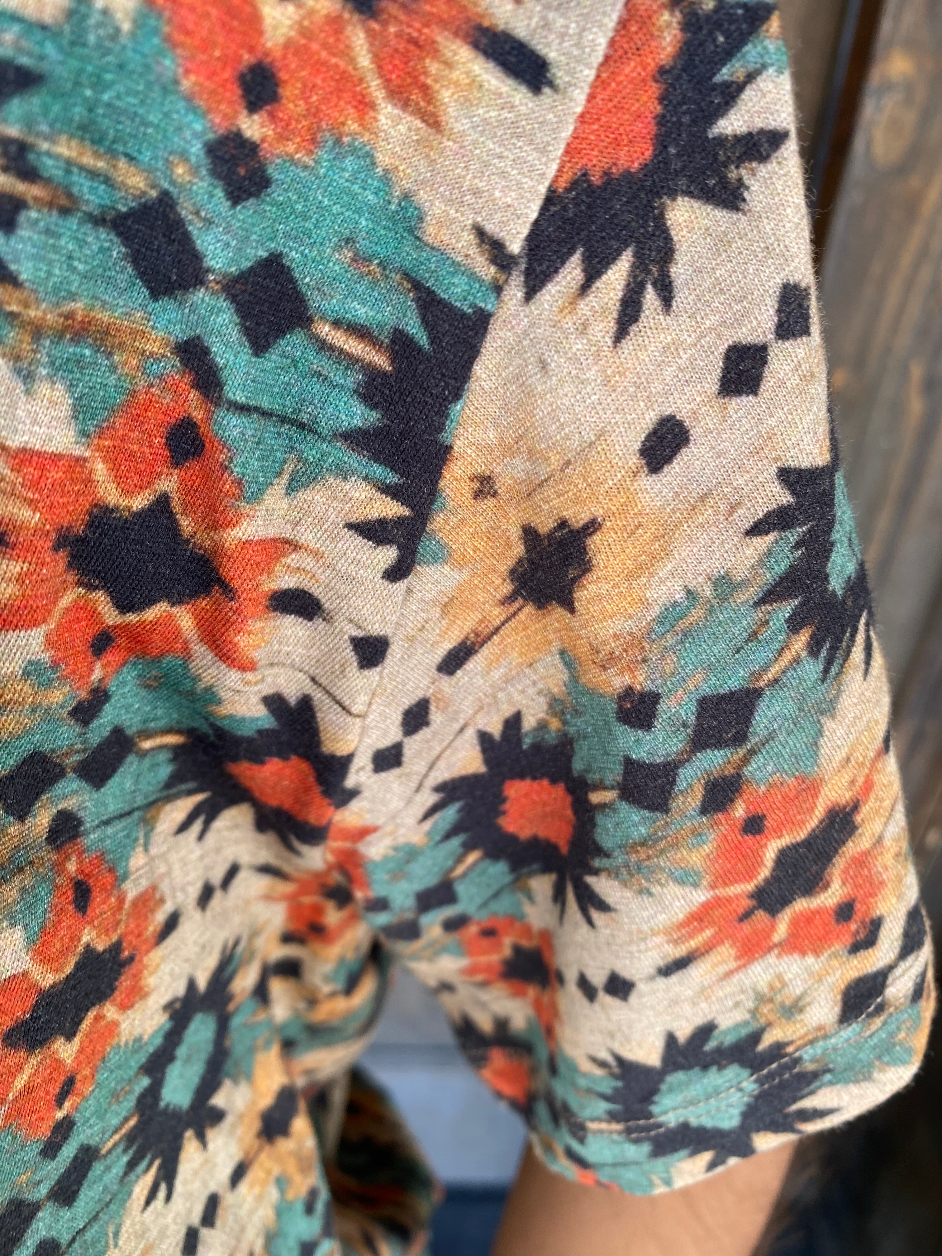 Add a dose of rich, rustic charm to your wardrobe with our "Southwest Basic Tee." This tee features a beautiful, intricate pattern inspired by classic Southwestern designs in a warm palette of olive green, rust, and turquoise. The soft, lightweight fabric and relaxed fit make it the perfect top for a look that's both comfortable and stylish. Whether you're dressing up your favorite denim or pairing it with shorts, this tee brings a touch of effortless style to any casual occasion.
