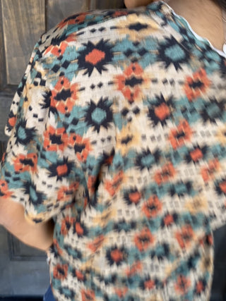 Rich Color Palette: A harmonious blend of olive green, rust, and turquoise makes this top a versatile piece.