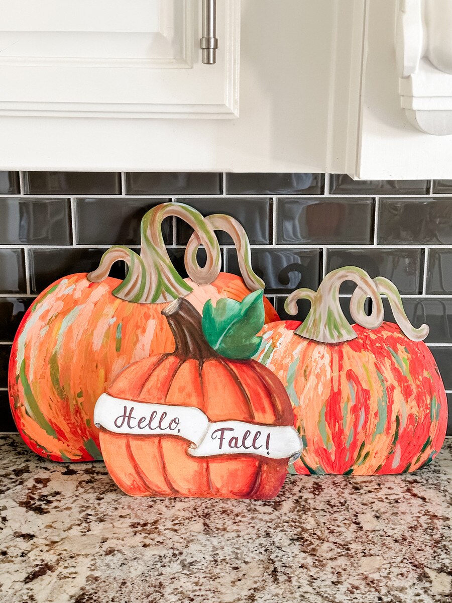 This hand-painted metal pumpkin sign is bursting with autumn charm. Featuring rich orange tones, a bold green leaf, and the cheerful greeting “Hello, Fall!”, it’s the perfect piece for kitchen counters, entryway tables, tiered trays, or covered porches. Whether you’re decorating for a harvest party or just love adding seasonal flair, this pumpkin adds a warm welcome to any space.
