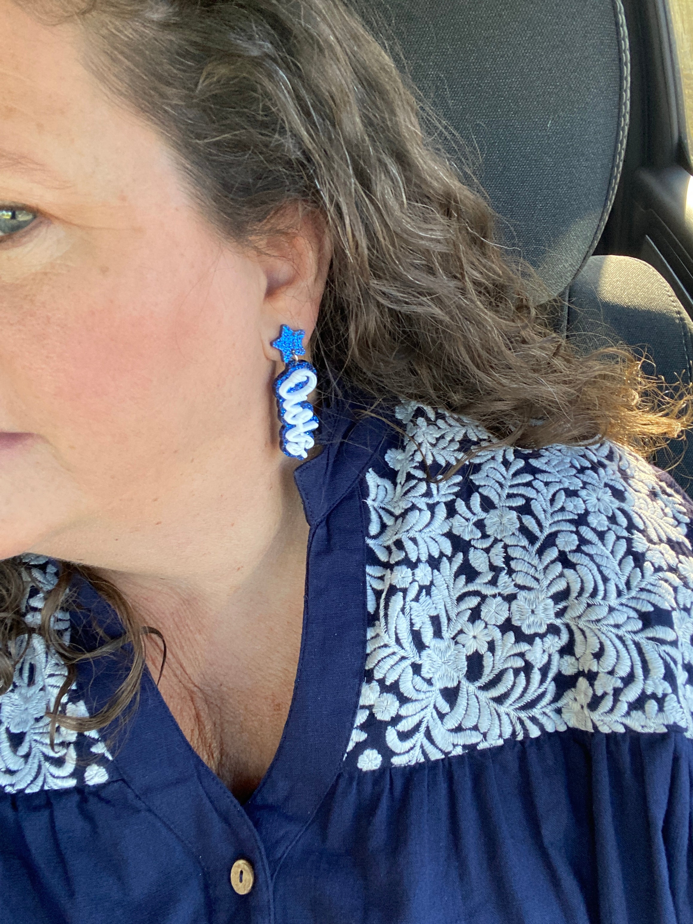 These glitter dangle earrings are the perfect accessory for any Hondo gameday. Featuring a bold blue star post and shimmering acrylic charm with “Owls” in a playful script, they’re lightweight, eye-catching, and full of team spirit.