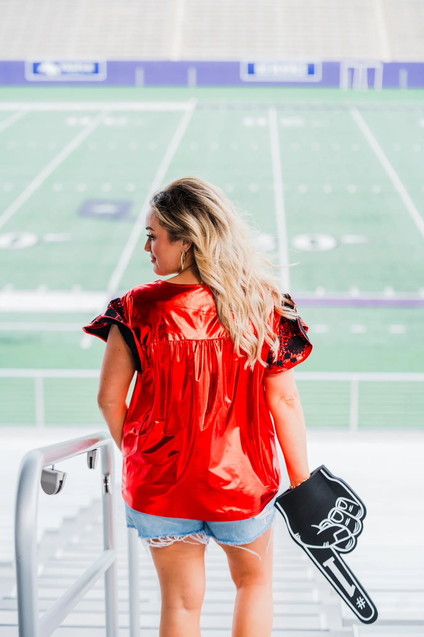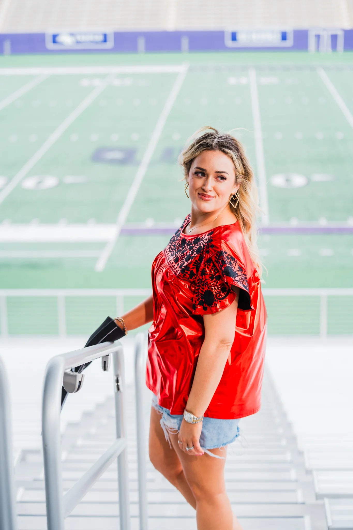 Shimmery soft satiny red with a silky texture to this Red Shimmer top, designed with an embroidered detail at the top and a flattering butterfly sleeves is sure to stand out! Not to mention it is perfect for game days, casual outings, or any occasion where you want to display your Texas Tech pride with style and elegance