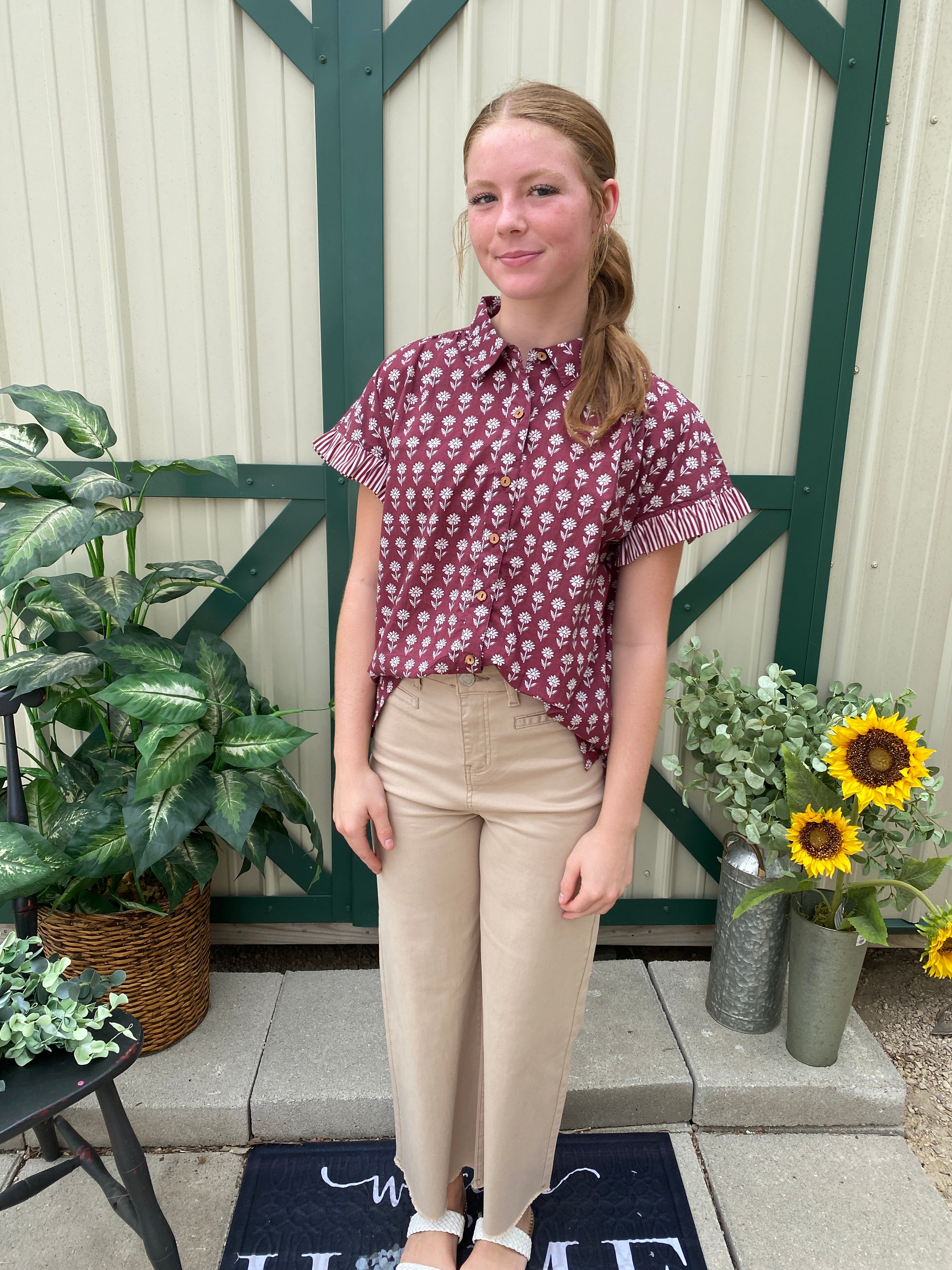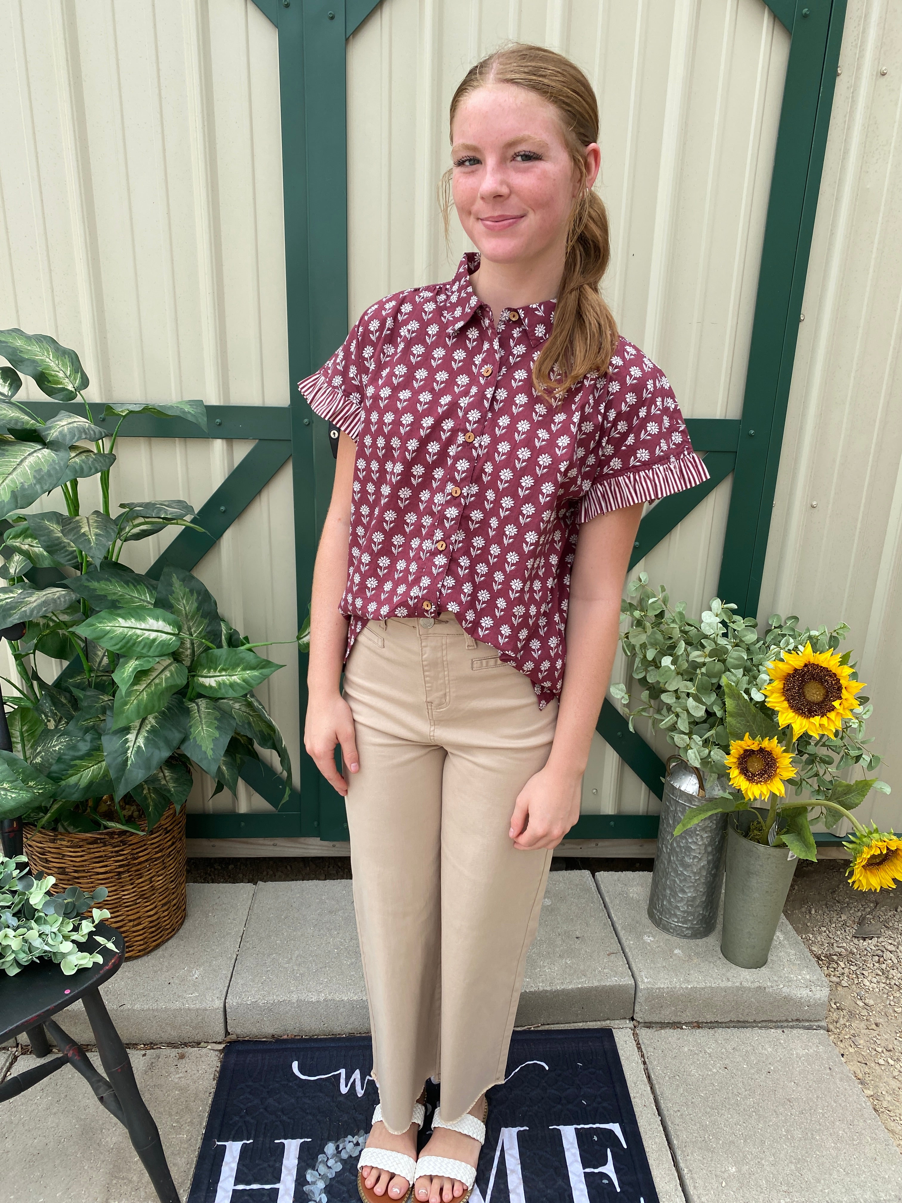 The Stevie Top in maroon brings effortless charm and all-day comfort in one easy-to-style piece. Featuring a bold maroon base with an all-over hand-block-inspired floral print, this button-up beauty is finished with coordinating striped details on the sleeves for just the right touch of contrast.