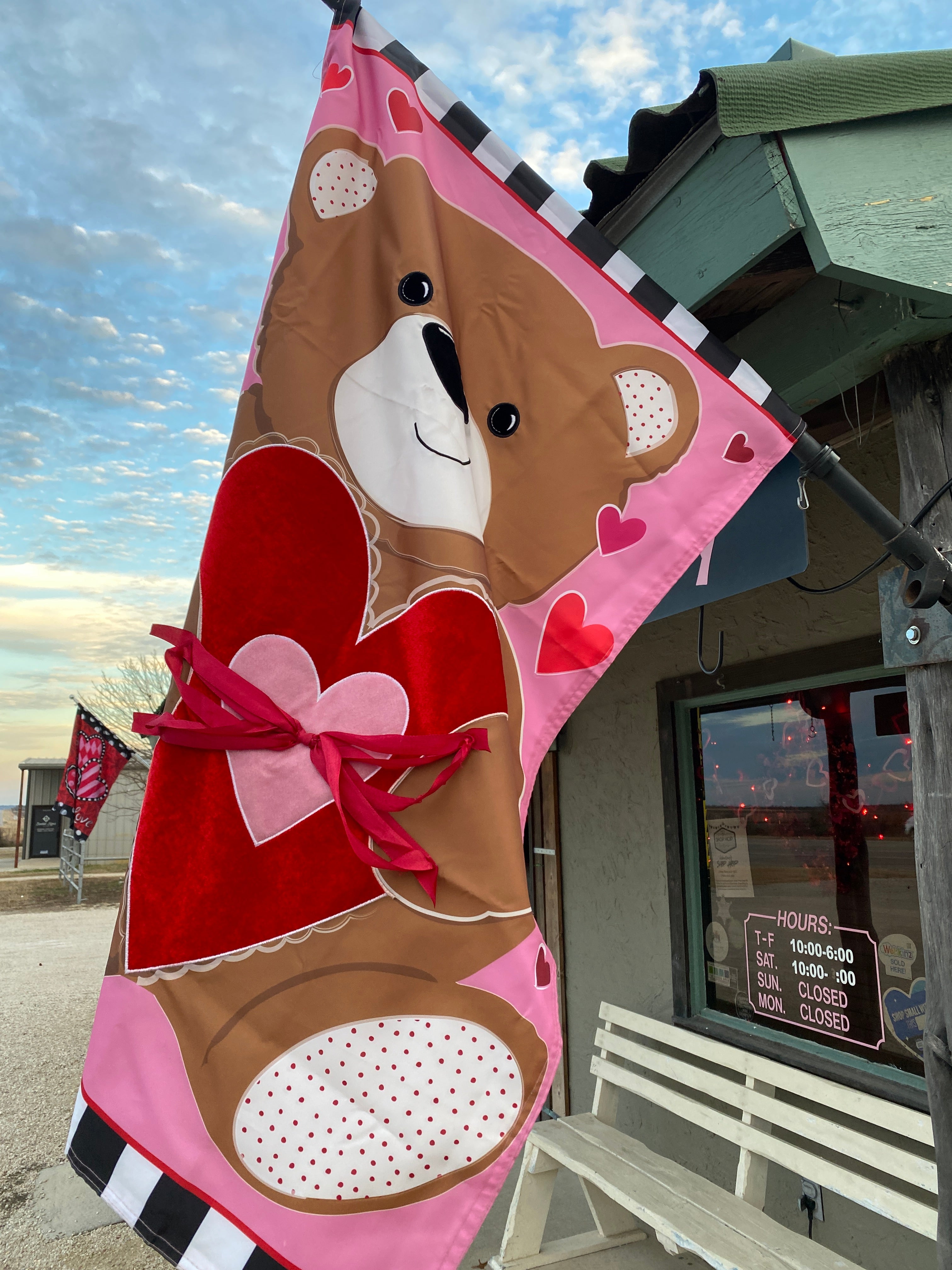 With its bold black and white check, cuddley teddybear holding a heart, this Valentine's Bear house suede flag is a cheerful way to greet guests and neighbors for Valentine's Day.