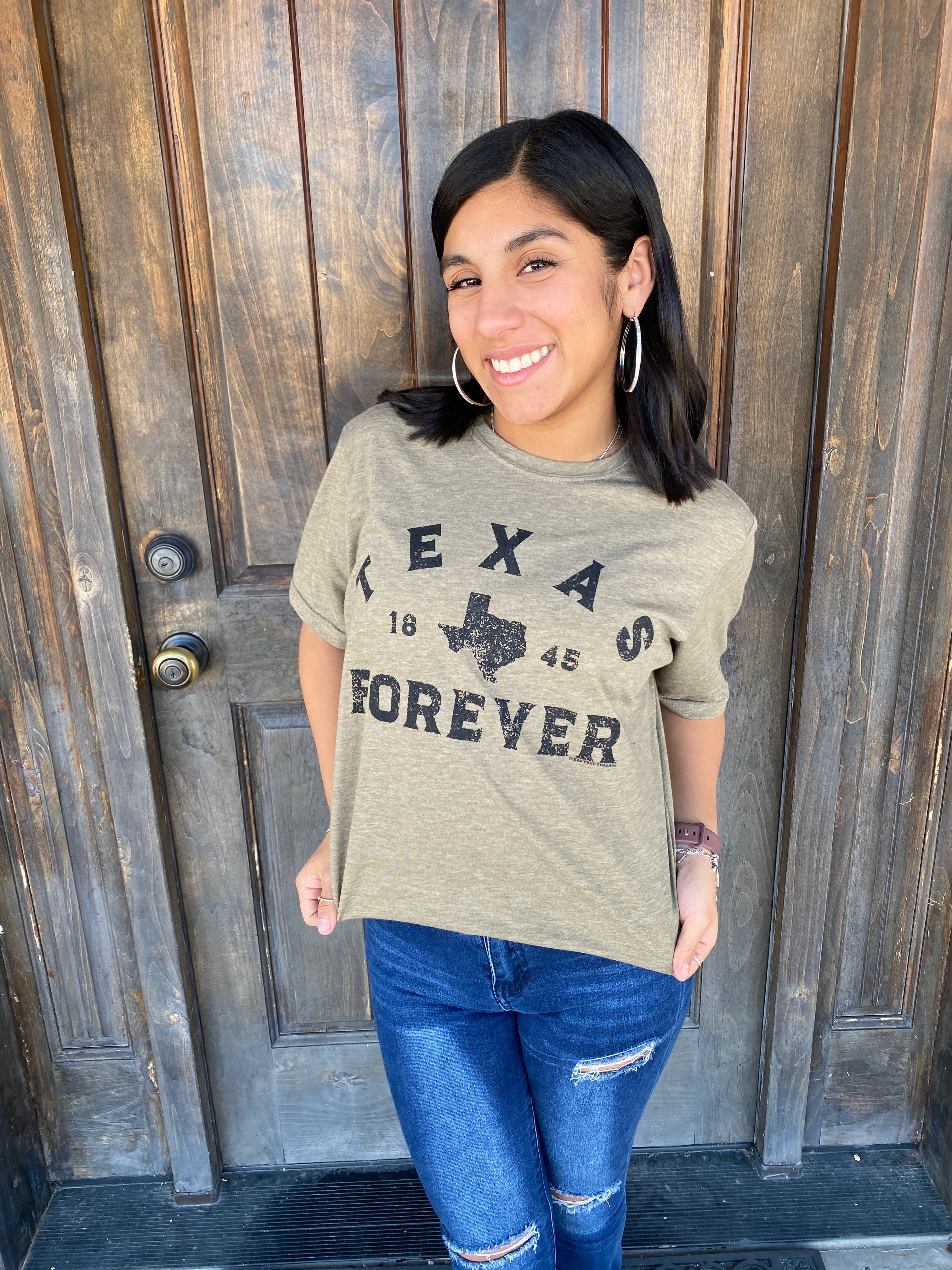 This olive green graphic tee is a tribute to the Lone Star State with a bold vintage-inspired print that reads Texas Forever with “1845” and the Texas state silhouette front and center. It’s classic, comfortable, and made for Texans at heart — whether you’re home on the range or headed to the stock show.Perfect for pairing with denim, joggers, or cutoffs, this tee has that worn-in softness that feels like an old favorite from day one.
