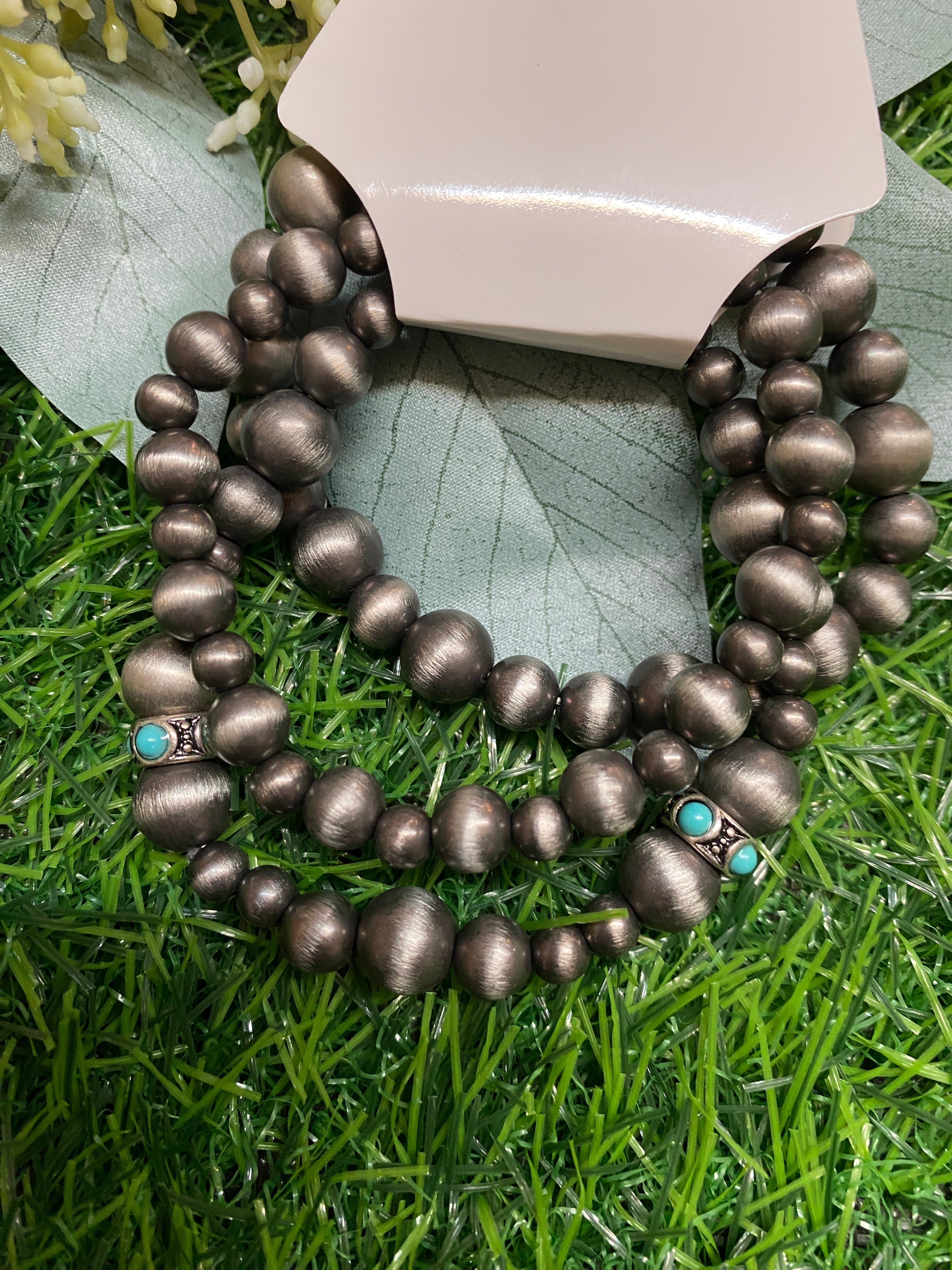 This western style bracelet has three strands of burnished look silver tone beads with stone rondelle beads mixed in.