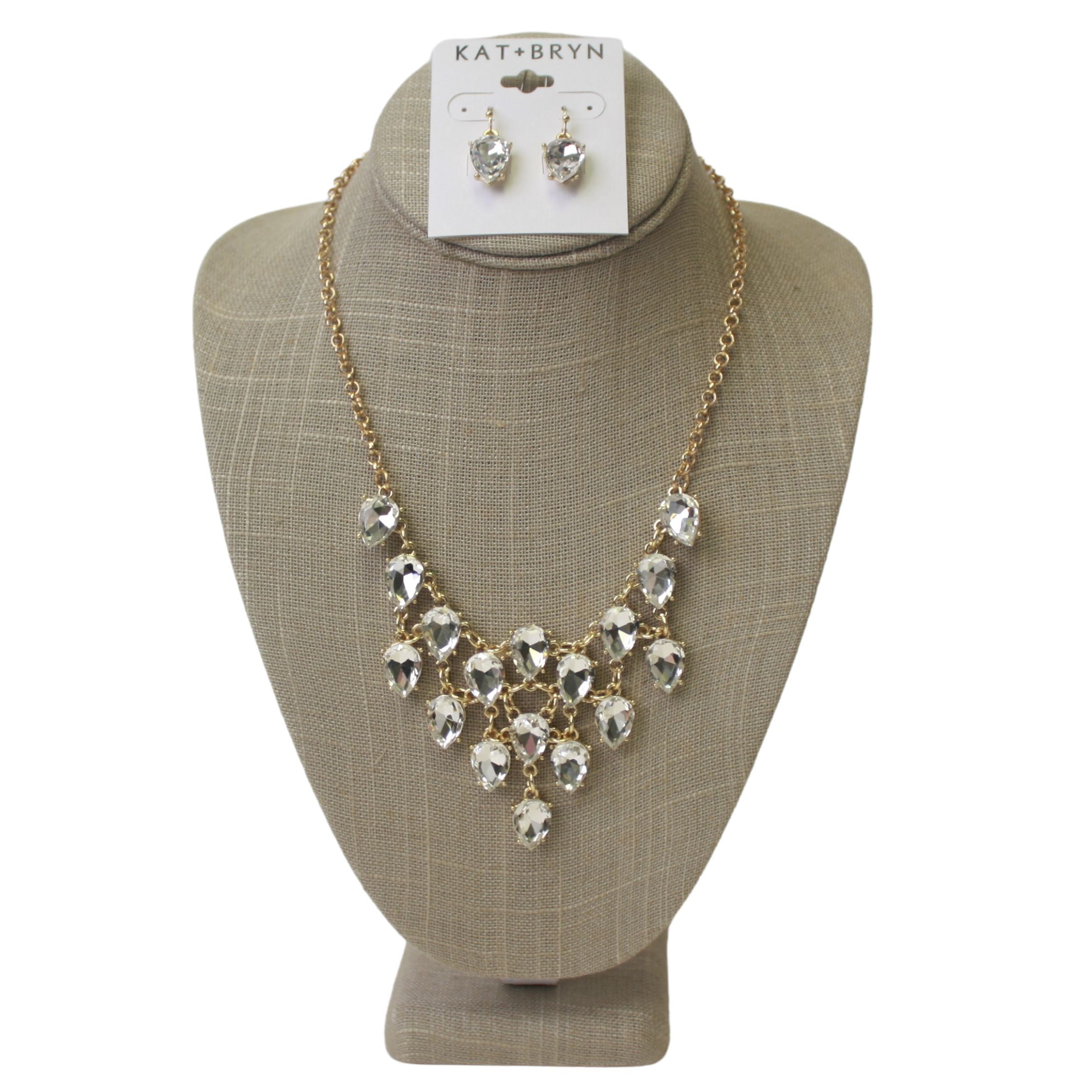 Add instant sparkle to your outfit with this eye-catching necklace and earring set. The silver-tone necklace features a graduated cluster of clear, faceted teardrop crystals for a brilliant, waterfall effect. It hangs from a simple chain and closes with a lobster clasp. Included are a pair of simple, matching crystal stud earrings. Perfect for parties, date nights, or as a thoughtful gift.