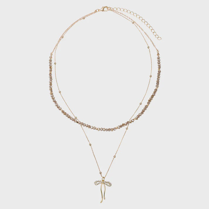 Elevate your everyday look with this feminine and sophisticated 2-layer necklace, featuring shimmering greige beading and a dainty gold bow charm. Whether you're dressing up a cozy sweater or adding subtle sparkle to your holiday outfit, this necklace blends charm and elegance with ease.
