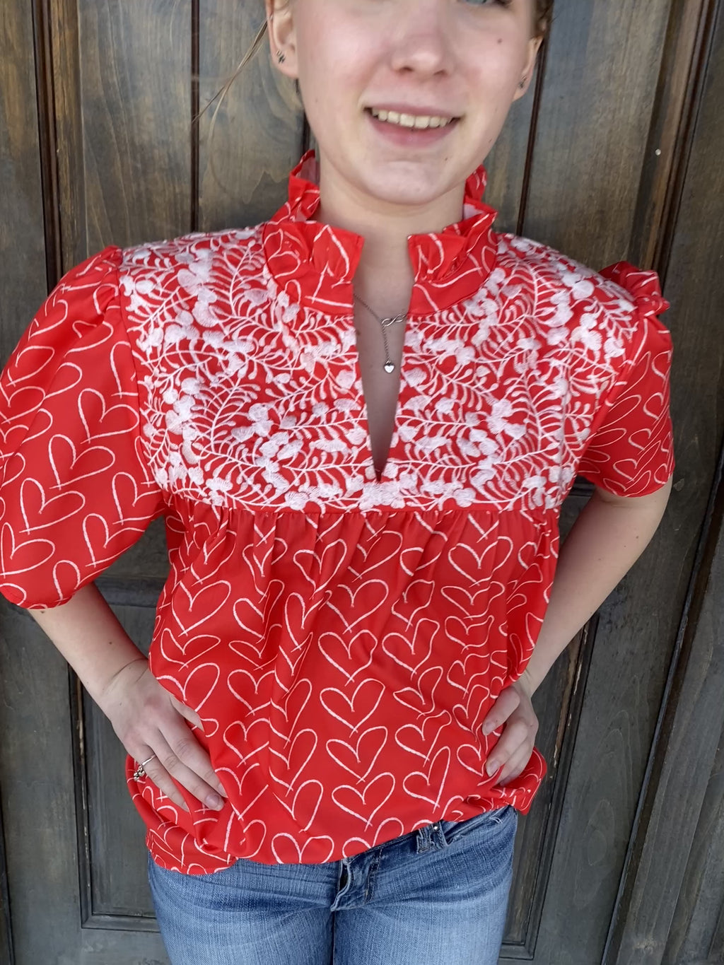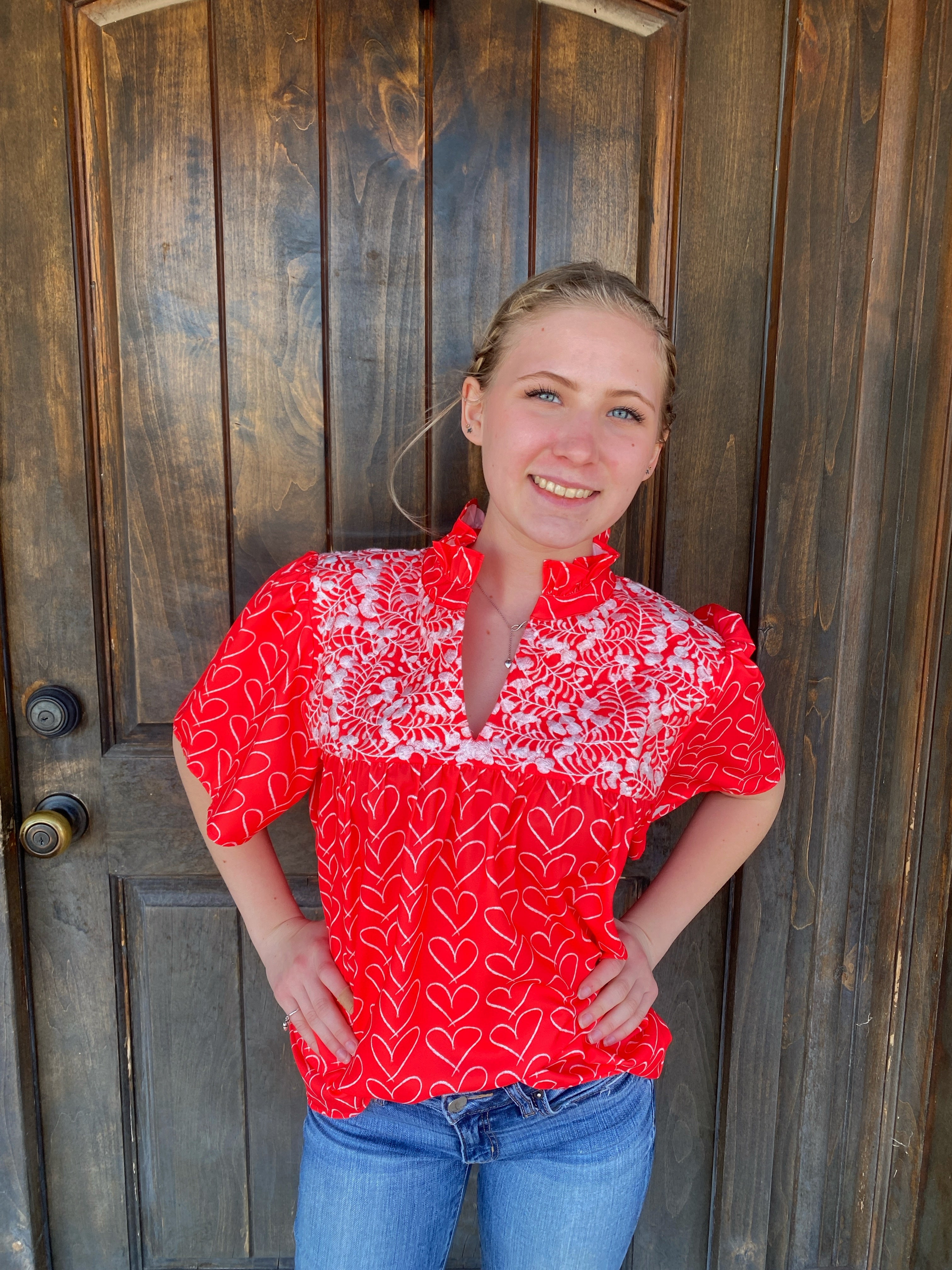 Fall in love with the vibrant charm of the Honey Blouse! This stunning top features a lively red hue adorned with delicate white embroidered details across the yoke and a playful all-over heart pattern. Designed with a relaxed fit and a flattering split neckline, this blouse is perfect for spreading joy, whether you're dressing up for Valentine's Day or embracing cheerful, everyday style.