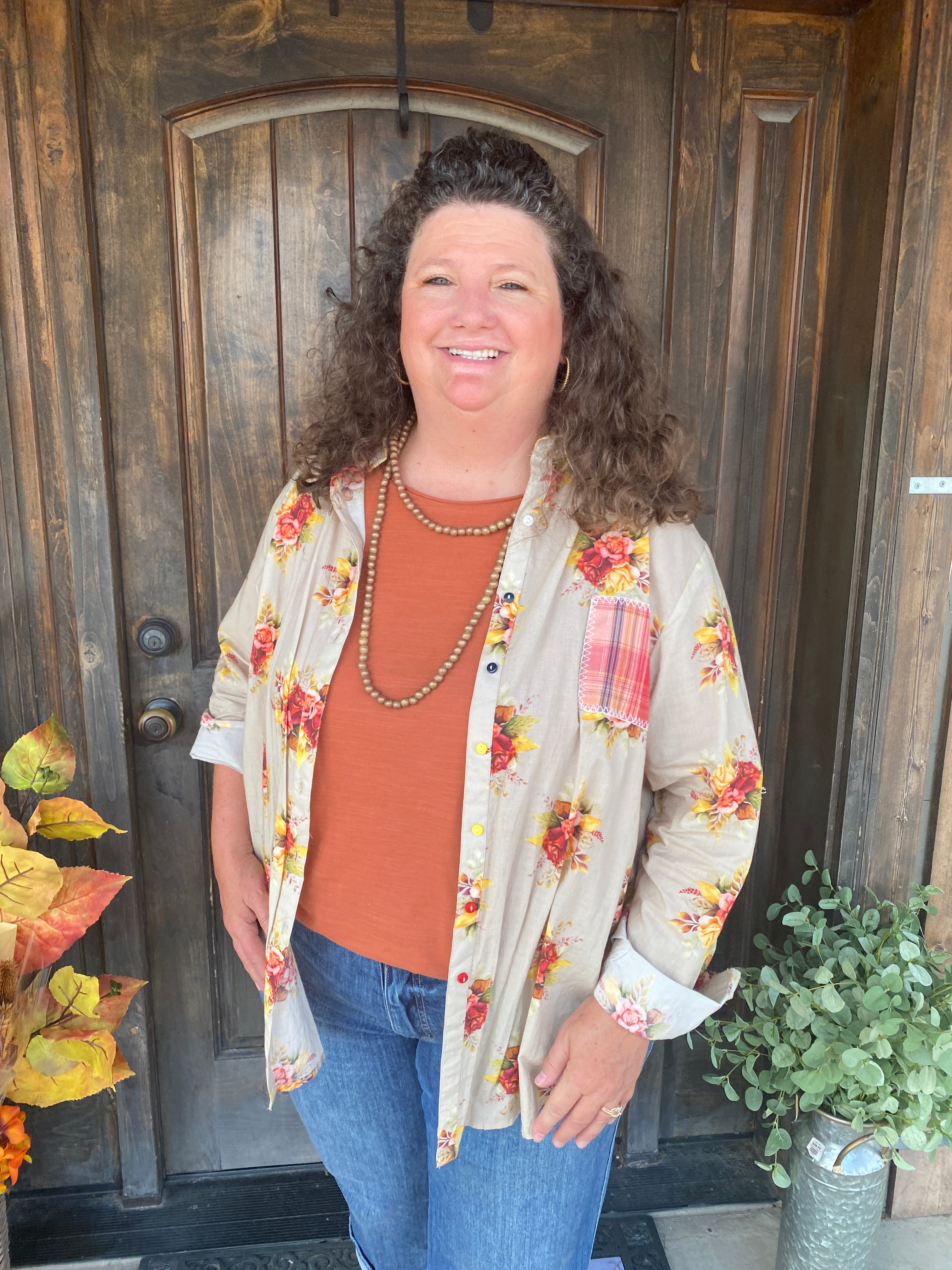 Add a touch of elegance to your casual wardrobe with our Floral Button-Down Top. Featuring a soft, floral print with delicate roses, this top brings a fresh and feminine vibe to your everyday style. The classic button-down design is complemented by a unique plaid patch pocket, giving this piece a playful twist. Whether you wear it as a stand-alone top or layer it over a tee, this versatile shirt is perfect for everything from brunch dates to casual days out. Pair it with your favorite jeans or cords for a chic, effortless look!