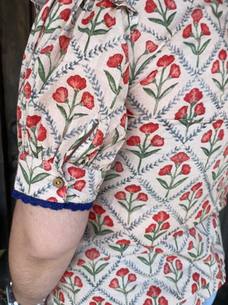 Step into effortless style with our "Haley Red Floral Top", a charming and versatile addition to any wardrobe. This exquisite blouse features a delicate red floral and green foliage pattern set against a natural background, reminiscent of a serene desert garden. The ruffled collar, V-neckline, and charming flutter sleeves, all accented with a tasteful blue trim, create a look that is both feminine and sophisticated. Perfect for adding a touch of bohemian elegance to your everyday ensemble.
