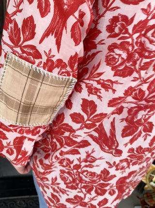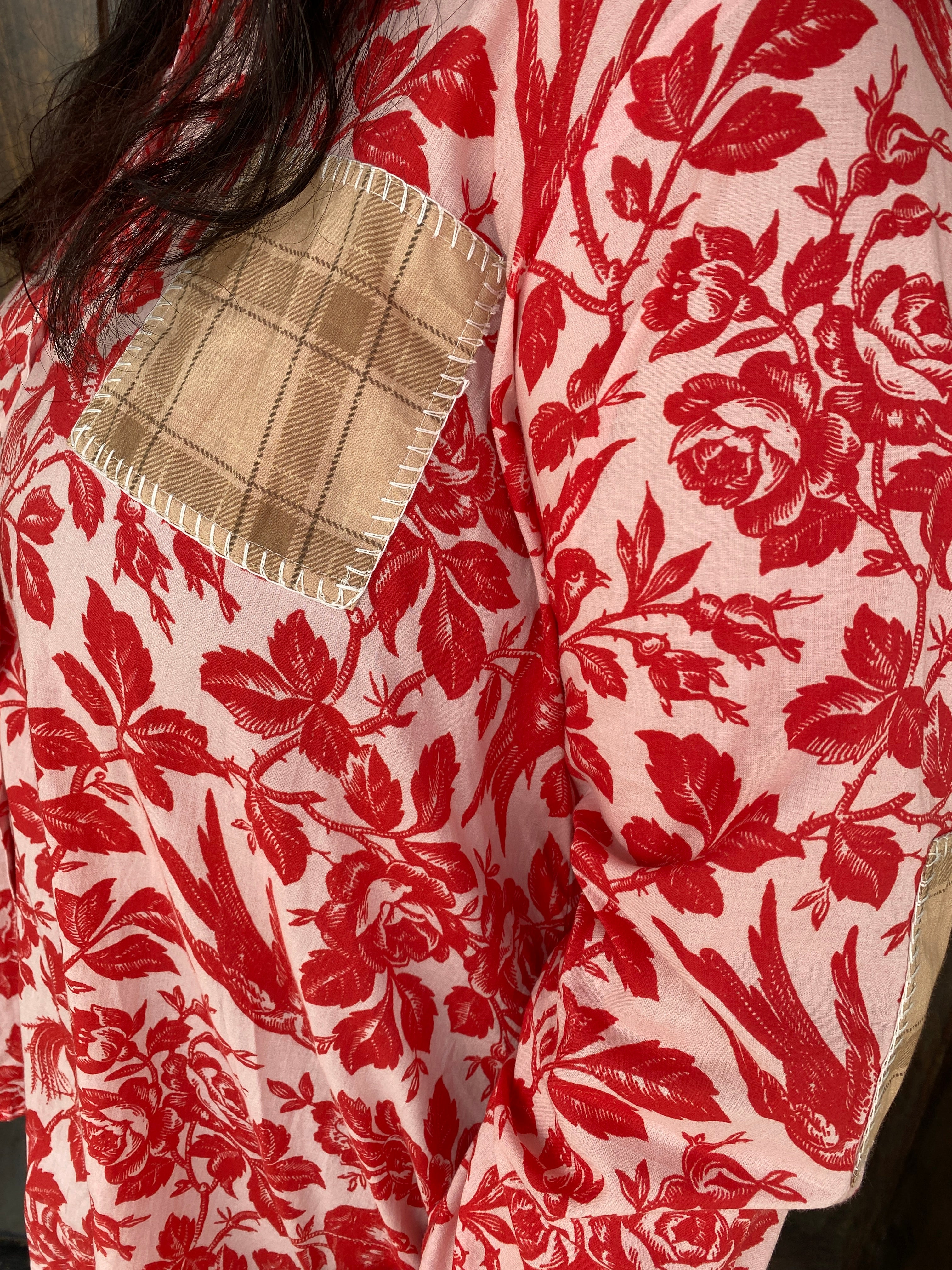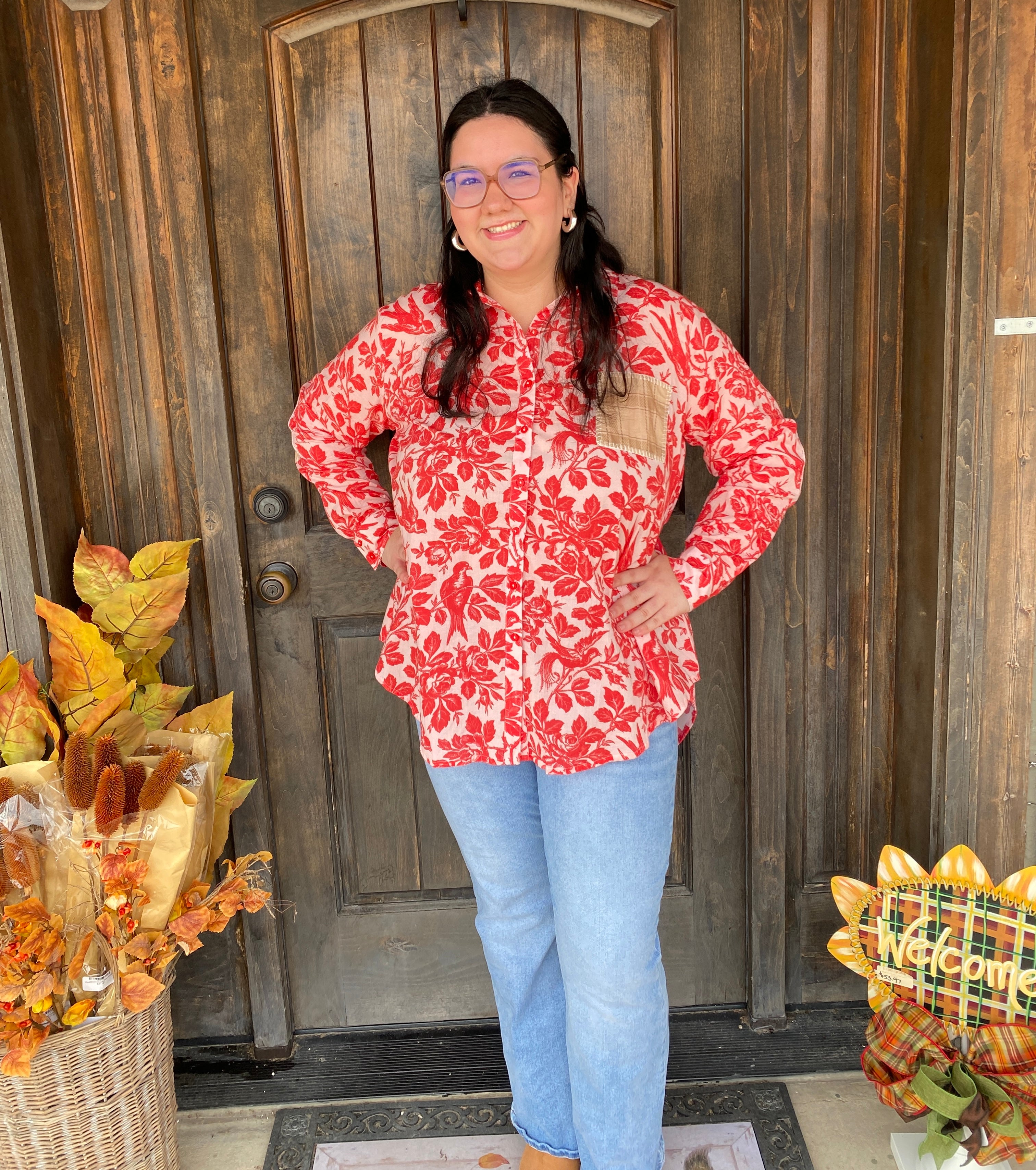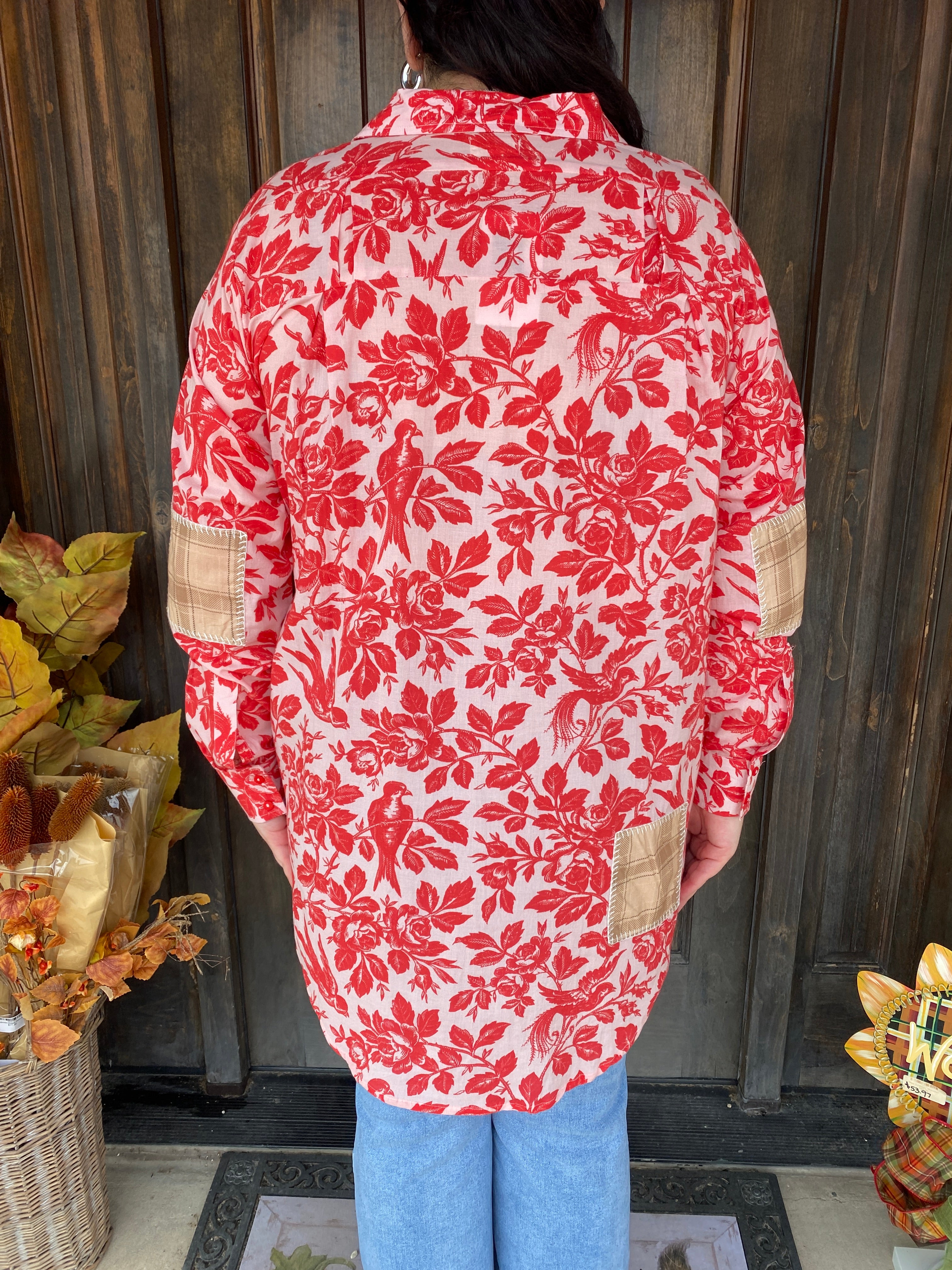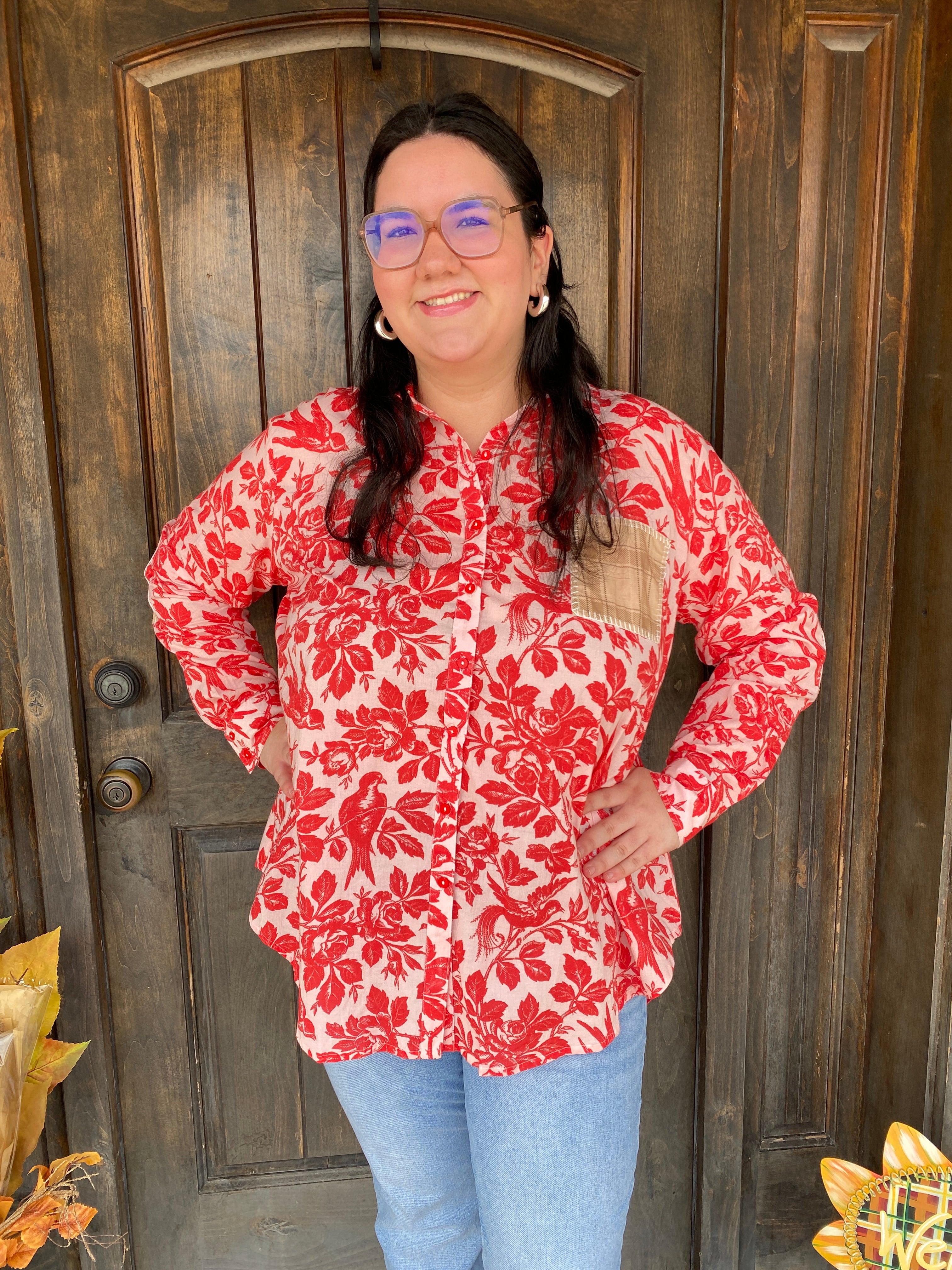 Elevate your wardrobe with the "Bird & Bloom Button-Up," a must-have for every fashion-forward woman. This vibrant, oversized top blends classic comfort with trendy style, making it the perfect piece for any occasion, from a casual brunch to a night out. The beautiful red and white floral print, paired with a unique plaid chest pocket, adds a playful yet sophisticated touch. Its relaxed fit ensures all-day comfort, while the long sleeves and collared design offer a timeless silhouette.