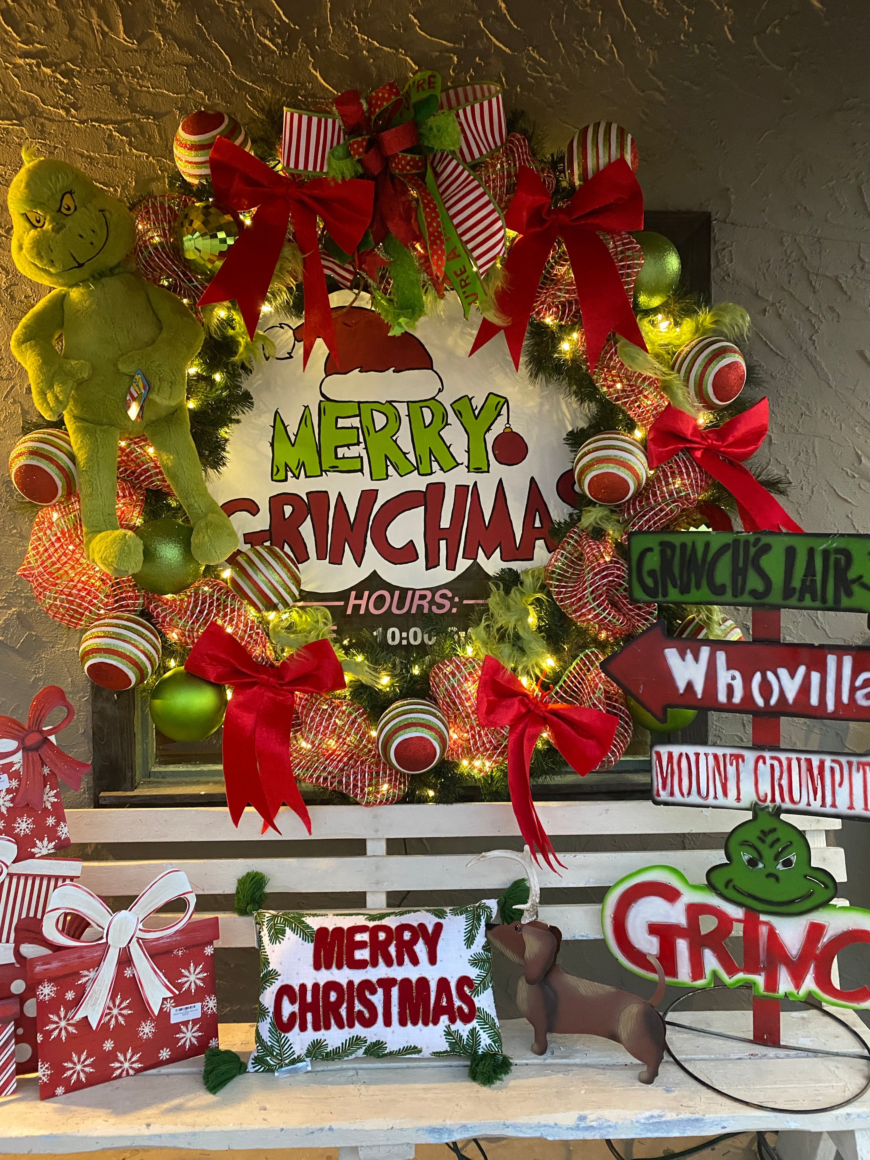 Built on layers of red, white, and green windowpane mesh, this wreath is full, fluffy, and sparkling from every angle. A large plush green Christmas monster steals the spotlight with that iconic grin loved by kids and grown-ups alike.Over-the-Top Holiday Details: