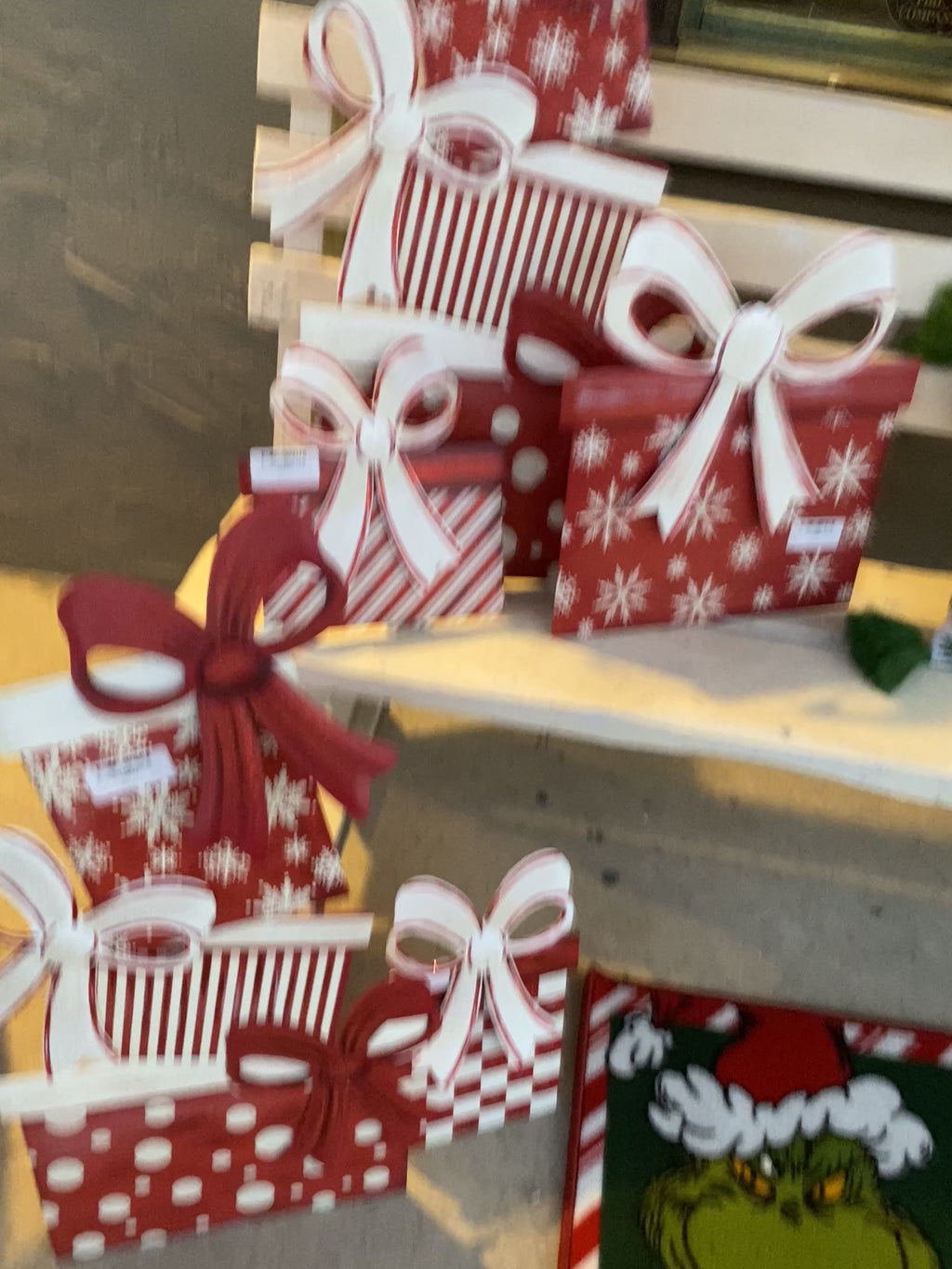 • Huge 7-ribbon bow at the top — including festive prints and a ribbon that reads “You’re a Mean One”