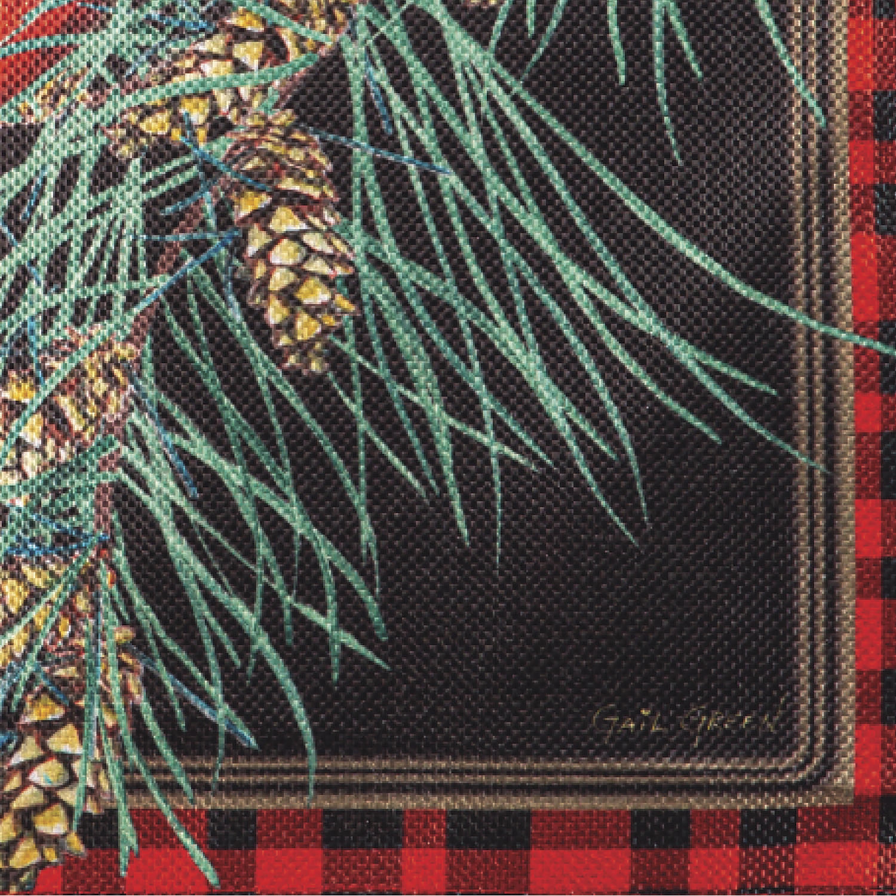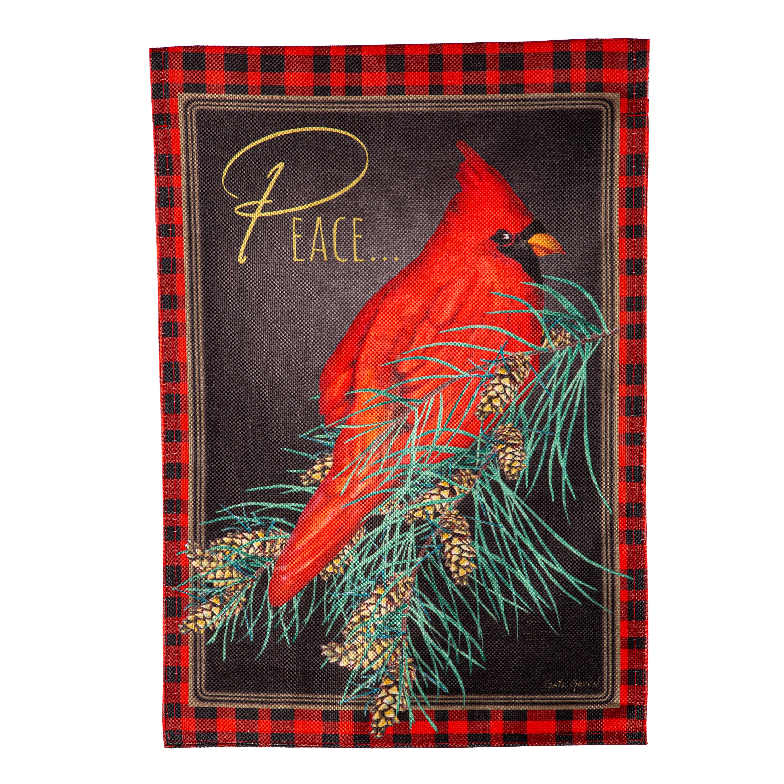 Decorate for the season and welcome friends and family to the home with this burlap garden flag. It features a beautiful cardinal sitting on a branch with pinecones. A red plaid border and sweet “Peace” message add the final touches to this flag. Crafted of medium-weight, soft polyester burlap fabric, this flag has the look and feel of real burlap. Artwork is heat transferred onto both sides of the textured fabric to create a natural, crafted look. The poly-burlap is a durable and weatherproof material that will not fade or fray after continued use. All flags also feature a sleeve for use with any standard flagpole or stand, sold separately.