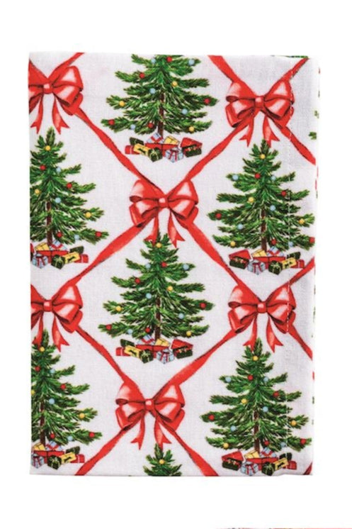 • Christmas Trees: A crisp white towel featuring a symmetrical pattern of decorated Christmas trees and red bows.