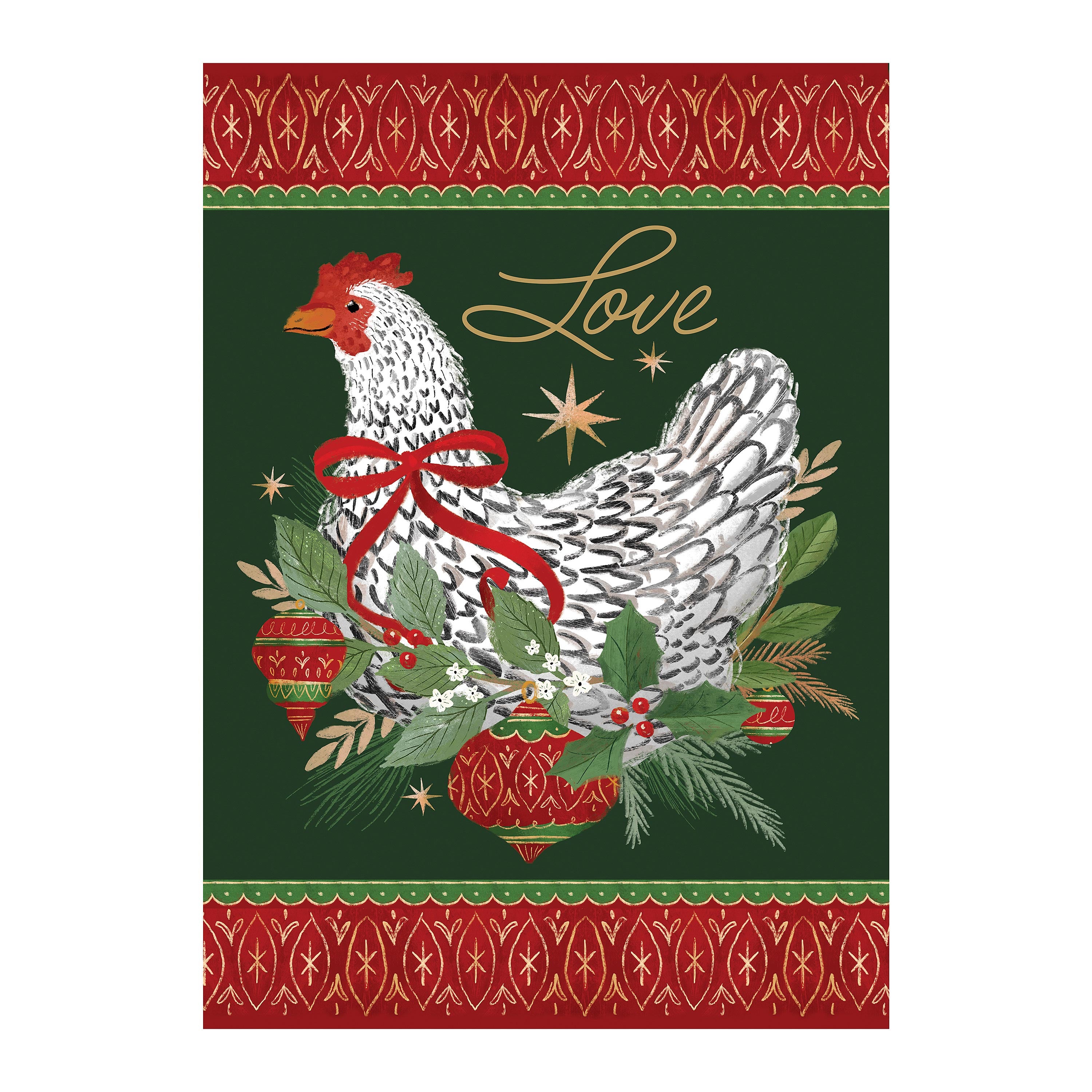 Add magic and wonder to any garden or yard when you hang up this beautiful flag. Featuring a darling chicken sitting in a nest of ornaments and winter foliage, this flag is perfect for the festive season. Flag is crafted of medium-weight suede fabric.