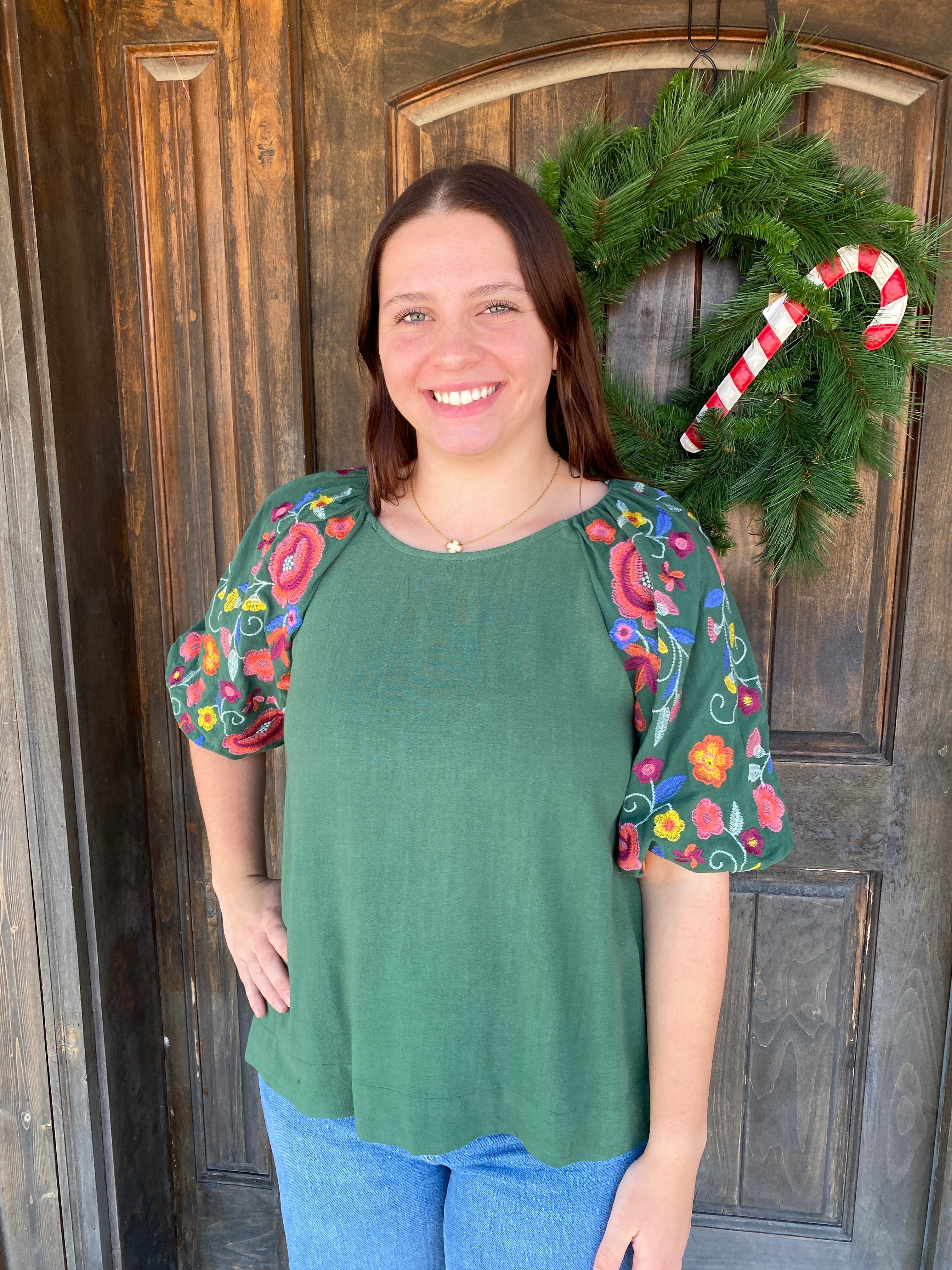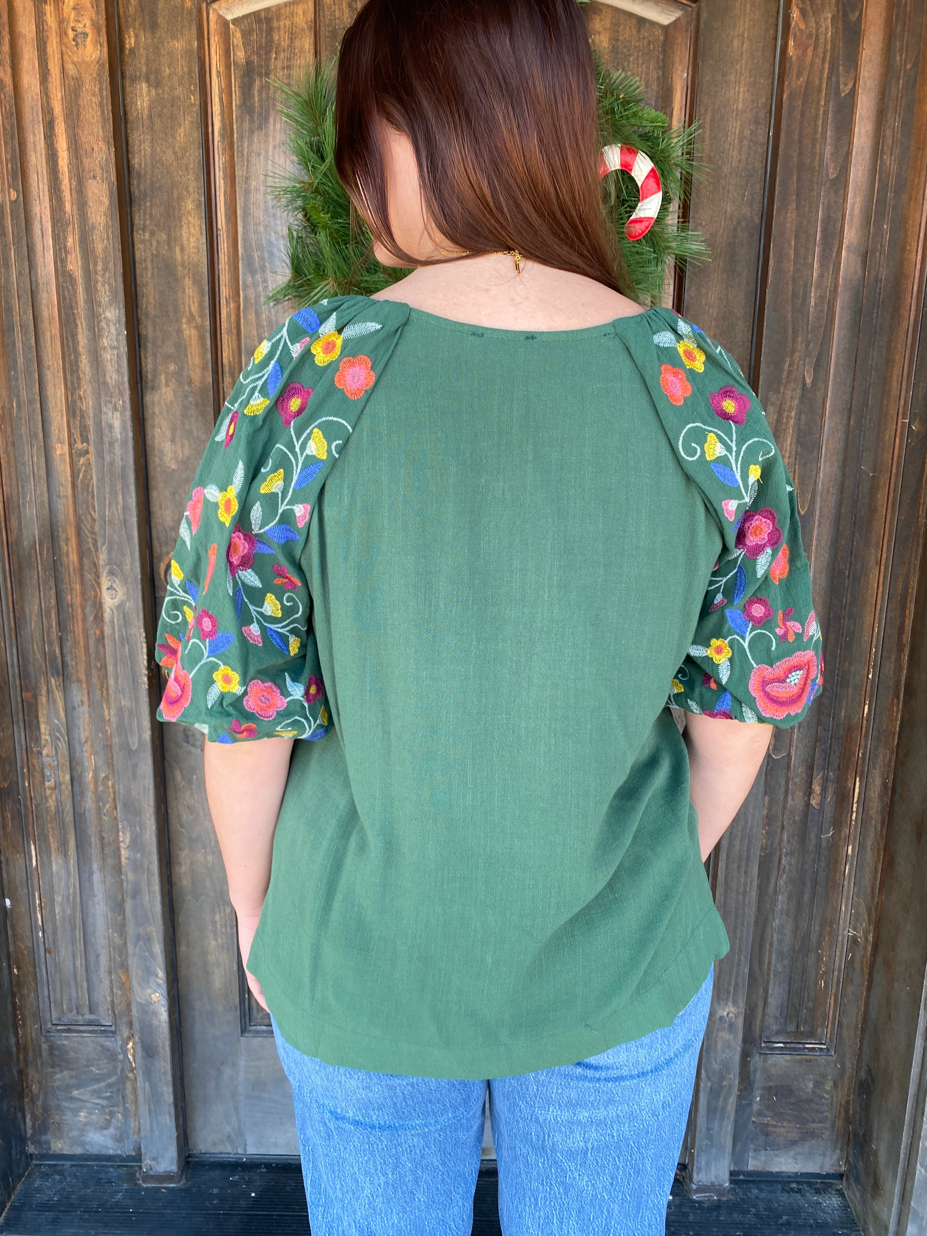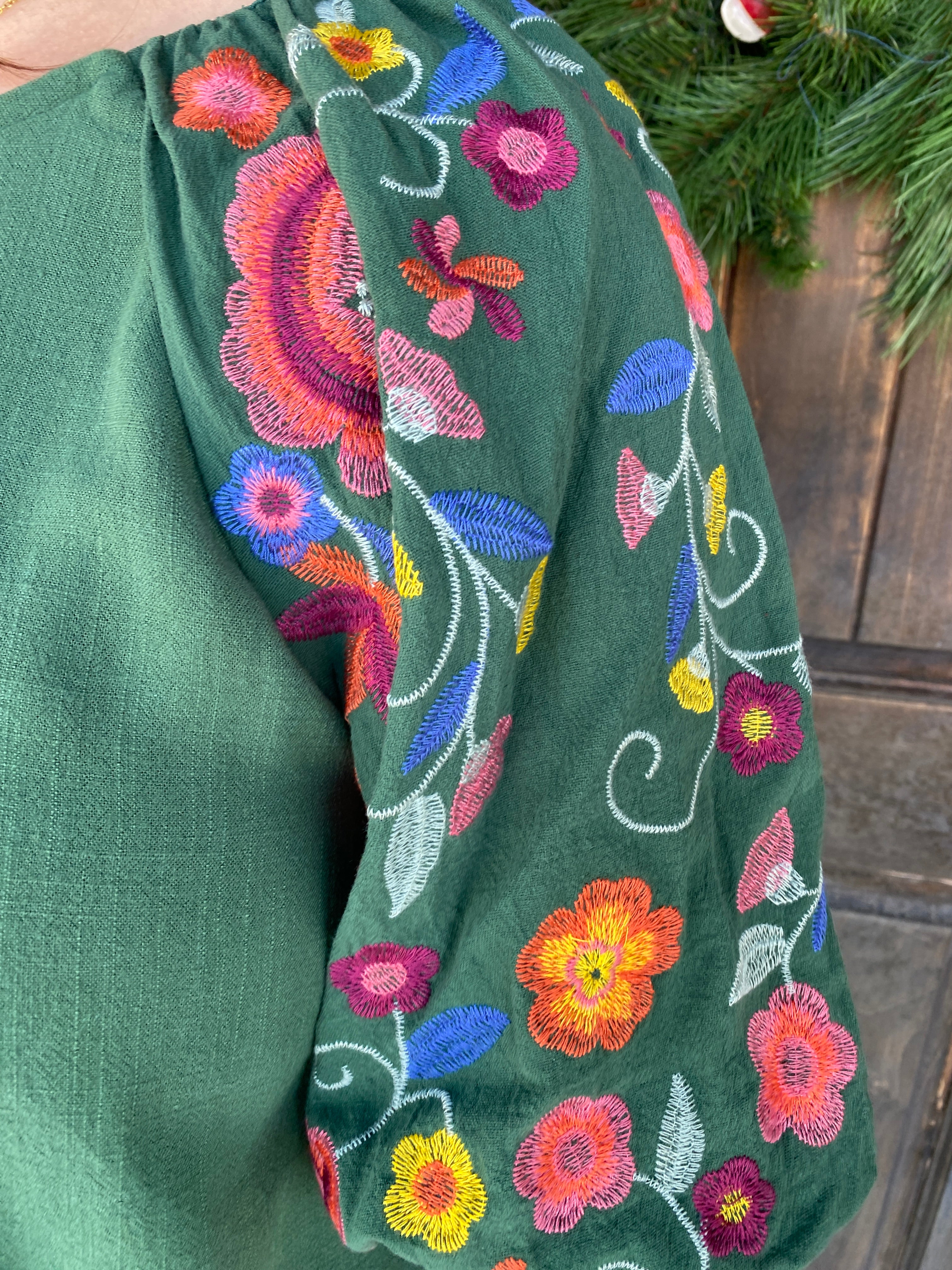 Forest Green Linen Blend Top with Embroidered Sleeves