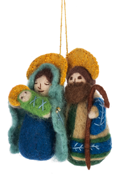 Celebrate the Nativity with this sweet and whimsical felted wool ornament of the Holy Family. Handcrafted with care, this ornament depicts Mary and Joseph holding the baby Jesus. Each figure is made from soft, colorful felted wool, giving them a charming, textured look.