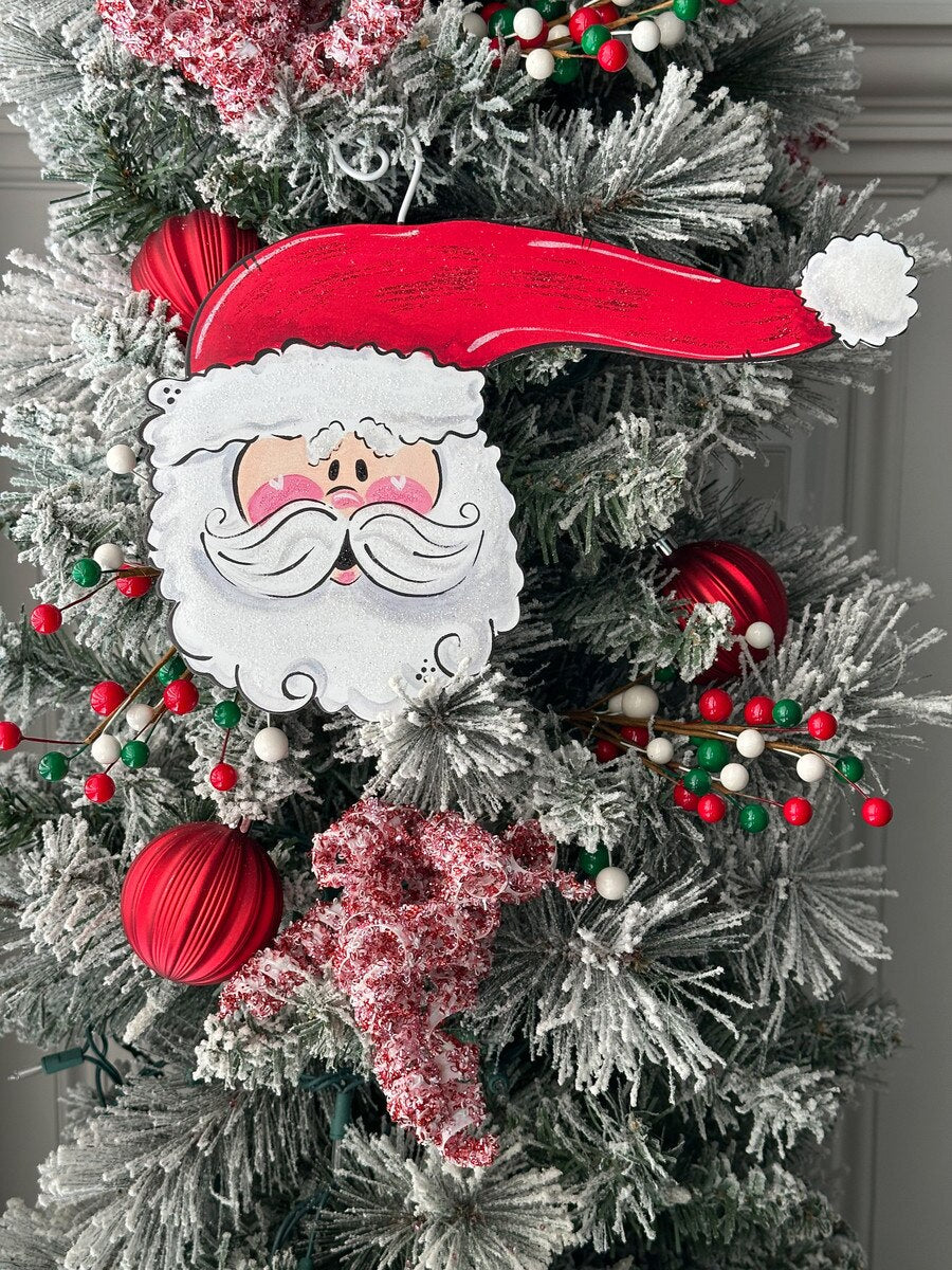 Add a cheerful and whimsical touch to your holiday tree with this Santa Claus metal ornament. This hand-painted, flat metal ornament features a dimensional design of Santa's head, complete with a big white beard, rosy cheeks, and a long, classic red hat with a white pom-pom. The hat's shape gives it a playful, dynamic look as if it's caught in a gentle winter breeze.