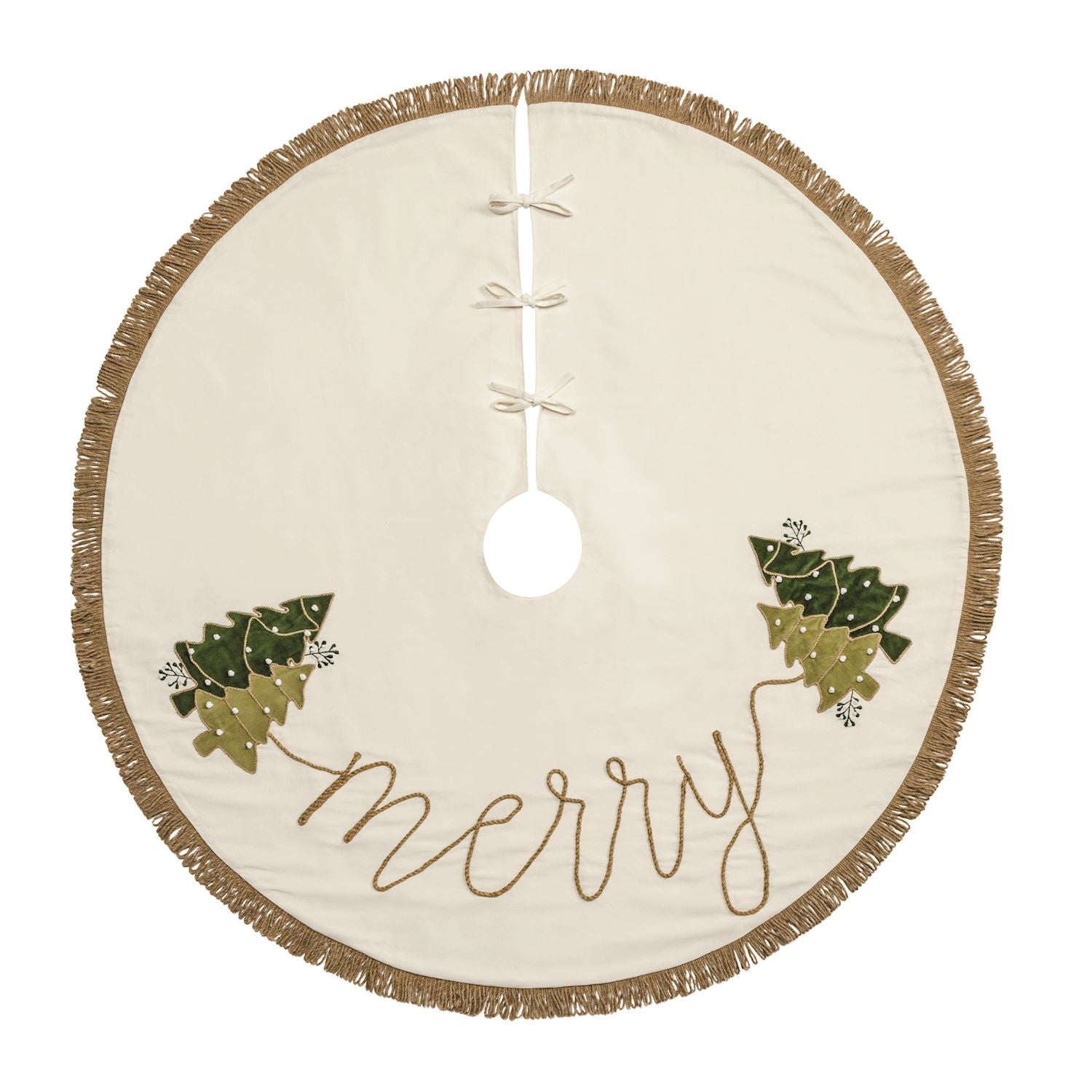 Deck your tree with a touch of rustic charm using this stylish "Merry" Tree Skirt. Made from a soft, natural off-white fabric, this skirt features a decorative fringed border in a light brown burlap material, adding a farmhouse feel to your holiday decor.
