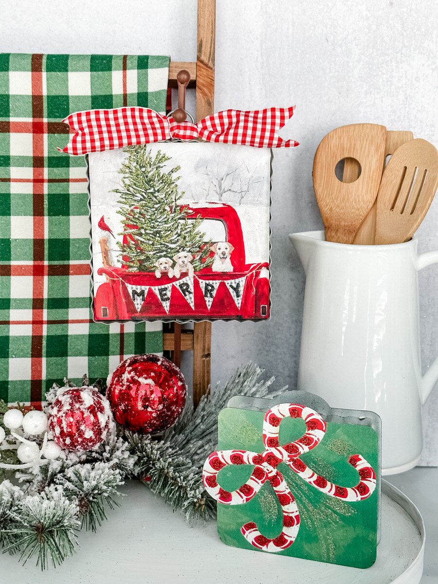 Bring a touch of cozy farmhouse charm to your holiday decor with this adorable "Merry Mutts" Gallery Charm. This square decoration features a hand-painted style scene of a vintage red pickup truck in a snowy landscape. The truck's bed is filled with a glitter-dusted Christmas tree and three sweet yellow lab puppies.