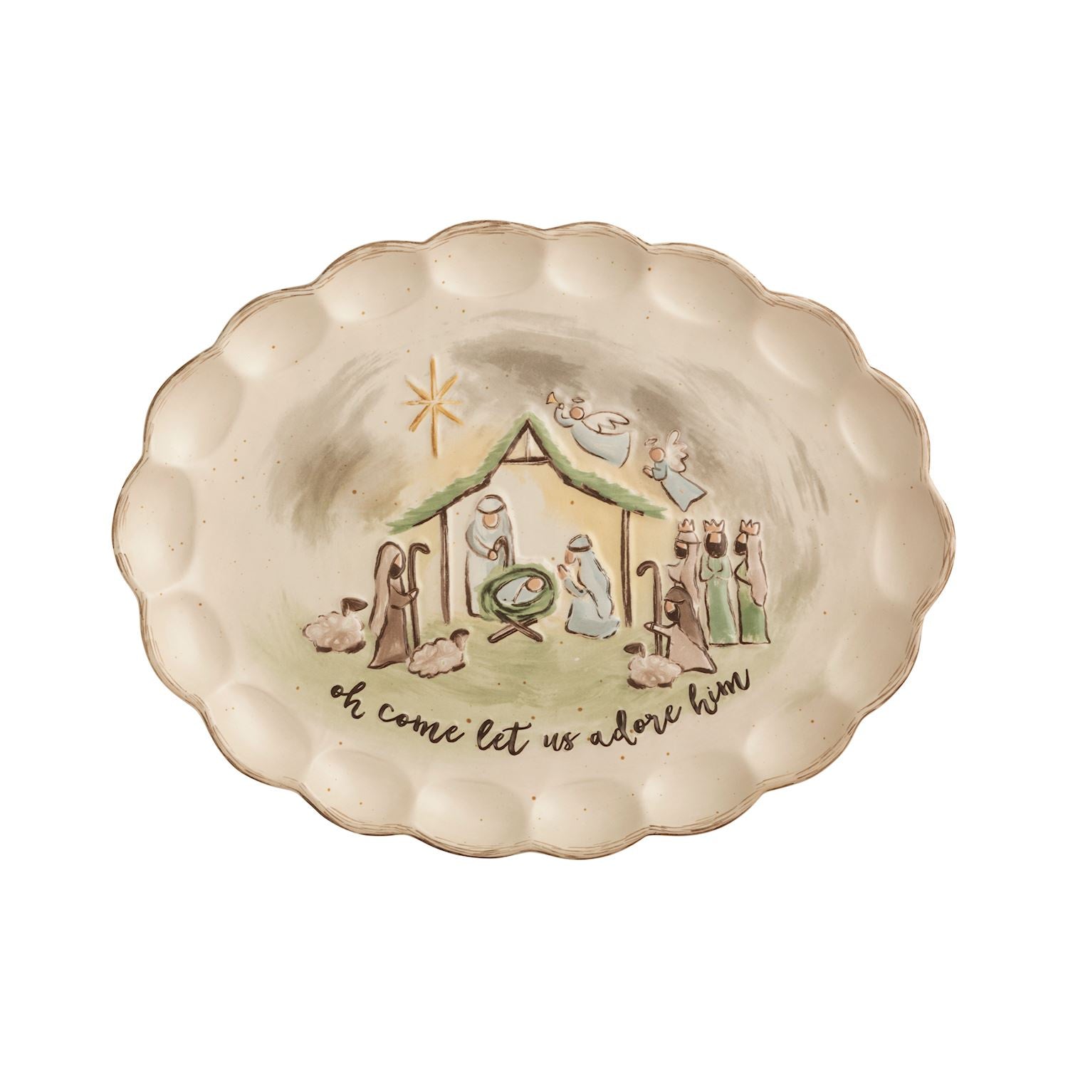 The platter features a classic scalloped edge and a distressed cream finish for a rustic, vintage look. The center is decorated with a hand-painted Nativity scene, complete with angels, shepherds, and the Holy Family, all in a soft, watercolor-like style. The phrase "oh come let us adore him" is inscribed at the bottom. The raised, dotted texture provides the perfect divots to hold your deviled eggs securely, keeping them from sliding around.