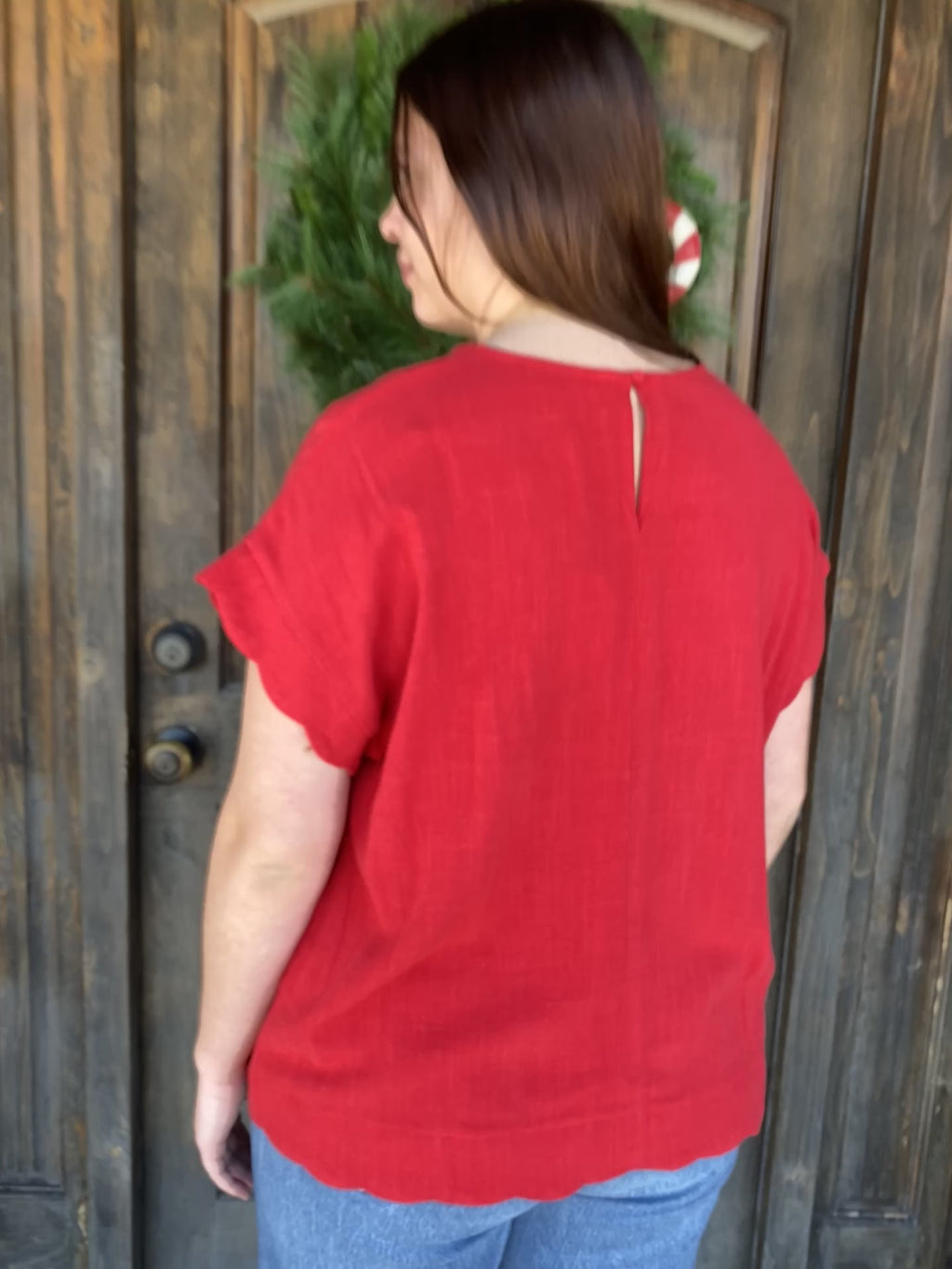 Add a cheerful pop of color to your wardrobe with this charming Red Linen Blend Top. Featuring delicate scalloped edges on both the hem and sleeves, this lightweight blouse brings feminine flair to your everyday look. The relaxed, flowy fit is perfect for holiday get-togethers, Sunday brunch, or simply dressing up your favorite pair of jeans.